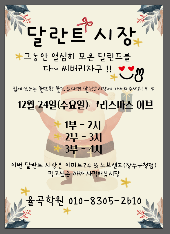 율곡학원 친구들과 함꺽 달란트 시장 열어요^^ ♡의미와 유래 ‘달란트’는 고대 지중해의 무게·화폐 단위에서 유래했으며, 성경의 ‘달란트 비유’로 재능·능력을 상징하게 되었습니다. 달란트시장은 율곡학원에서 모의 화폐(달란트)를 모아서 음식·물건 등을 구매하는 행사입니다. ♡운영 방식 아이들에게 숙제를 잘 이행시 모의돈(뺏지나 스티커)지급하고, 50장이 모이면 이마트24편의점(장수군청점)쿠폰으로 교환 이번에는 달란트 시장에서 쓸 수 있도록 교환합니다. 학원에선 떡볶이·과자 등을 구매했는데 이번엔 편의점에서 아이들이 사 먹고 싶은 간식..등 화폐 금액만큼 구매 후 집으로 가져가도 되고 학원에서 먹고가도 됩니다. 공부에....... <img src="https://blogthumb.pstatic.net/MjAyNTEyMTBfMjg5/MDAxNzY1MzcwMDAzNDQ2.s6vz8BHsZzrFS2zrL2Gj5xg6MXBpq2Sya9Xp9INDLM8g.K1tZXXwf2XsVDJYULznuHpGTf6ZDuGjJptL1rQZgAx0g.PNG/1765347485597.png?type=s3" />