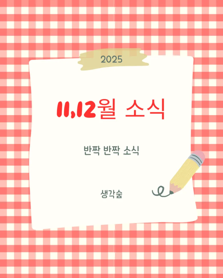 11월과 12월의 경계에 서면, 가을의 마지막 색이 천천히 지고 초겨울의 첫 기운이 조용히 내려앉습니다. 바람은 조금 더 차가워지고, 아이들은 조금 더 여물어가며, 하루하루가 깊어지는 계절입니다. 생각숲에서는 이 시간 속에서 아이들의 마음과 생각이 어떻게 익어가는지 바라봅니다. 낙엽이 떨어지며 숲이 단단한 뿌리를 드러내듯, 아이들도 스스로의 힘을 키우는 시기. 조금은 느리게, 그러나 분명하게 성장하는 모습을 함께 발견하고 기록해가려 합니다. 11월과 12월의 계절 스케치처럼 차분하지만 따뜻한 교육 이야기, 마음이 쉬어가는 부모 성장 이야기, 그리고 아이들의 반짝이는 성장을 담아 생각숲이 전해드립니다. 11월 생각숲 소식....... <img src="https://blogthumb.pstatic.net/MjAyNTExMThfMTkg/MDAxNzYzNDY5MDcxMDc1.tE12x7mH_tpyftrquscJZP6iqN1tpAl3RESLaQ_psQcg.xMQeFKV9TTI3L6ZOC2UdKd9mM21okQSxTpLAl452iAIg.PNG/900%A3%DF%B3%EB%B6%F5%BB%F6_%C8%F2%BB%F6_%B1%CD%BF%A9%BF%EE_%C3%BC%C5%A9%B9%AB%B4%CC_%B8%DE%B8%F0_%B0%F8%C1%F6_%BE%C8%B3%BB_%C0%CE%BD%BA%C5%B8%B1%D7%B7%A5_%C6%F7%BD%BA%C6%AE%A3%DF20251110%A3%DF165937%A3%DF0000.png?type=s3" />