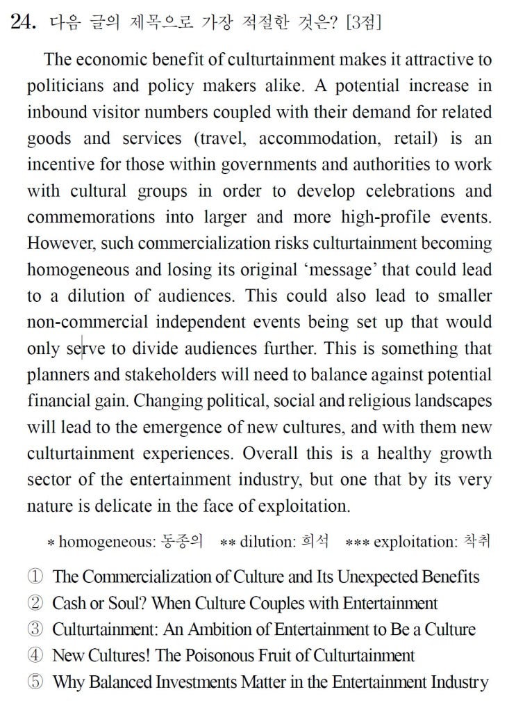 안녕하세요. 중계동 은행사거리에서 15년 동안 아이들과 함께 울고 웃으며 영어를 가르쳐 온, 중계동 영어 교육 전문가입니다. 중학교 1학년 자녀를 둔 학부모님, 혹은 이제 고등 입시를 본격적으로 준비하는 고2 학생들을 만나다 보면 가장 많이 듣는 질문이 있습니다. "선생님, 우리 아이 중학교 성적은 A등급인데... 고등학교 가서도 잘할 수 있을까요?" 이번 수능 영어, 만만치 않았죠? 특히 24번 제목 추론 문제에서 머리를 싸맨 친구들이 많았을 겁니다. "분명 해석은 다 된 것 같은데, 답이 안 보여요..." "2번이랑 4번 중에 고민하다가 틀렸어요 ㅠㅠ" 오늘 이 포스팅 하나로 24번 'Culturtainment&#....... <img src="https://blogthumb.pstatic.net/MjAyNTExMjZfMjEz/MDAxNzY0MTI2OTAwNTEy.FNkJL-0iTxULWKahA7Sz4tWfCdW6Xt5HXElHlzOOBp4g.Cy4mTbRi-sYj_QkBMp_BkViq8MVC_nibJxj27ub2w7cg.JPEG/%BC%F6%B4%C924%B9%F8.JPG?type=s3" />