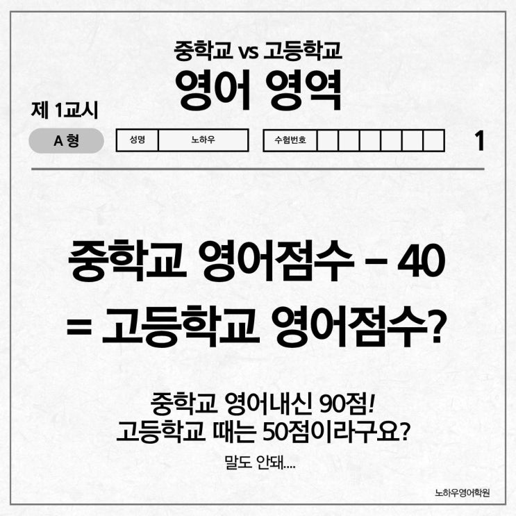 가장 위험한 건, 지금 자신이 위험한 상황에 있다는 걸 모르는 것입니다. 안녕하세요 초등부터 고등까지 영어를 전문적으로 지도하는 노하우영어학원입니다! 오늘은 예비고1 학부모님께 꼭 드리고 싶은 이야기를 나누고자 합니다 "고등영어 준비는 잘 되어가시나요?" 입시 영어 업계에는 이런 말이 있습니다 [중학교 내신 90점] = 고등학교 내신 50점? “중등 영어 성적에서 40점을 빼야 고등 영어 점수다” 이 말이 과장이 아닐까 생각하시는 분들도 있을테지만, 이미 최근 고등학생 자녀의 입시를 경험해보신 학부모님들께서는 과장이 아닌 사실임을 잘 알고 계실 것입니다 중학교 중간·기말고사에서 높은 점수를 받았다는....... <img src="https://blogthumb.pstatic.net/MjAyNTExMjlfMTM3/MDAxNzY0NDI1NDAzODMx.TbsBDPNw_8nWMQ9ONzG3Xq6z5vfVrsDW9iYJepwJpOcg.LdhbSikA9gKNTYwCFO_tqeplpQnxNHvqYZ5M2sr1H14g.JPEG/%C1%A6%B8%F1%C0%BB_%C0%D4%B7%C2%C7%D8%C1%D6%BC%BC%BF%E4._%282%29.jpg?type=s3" />