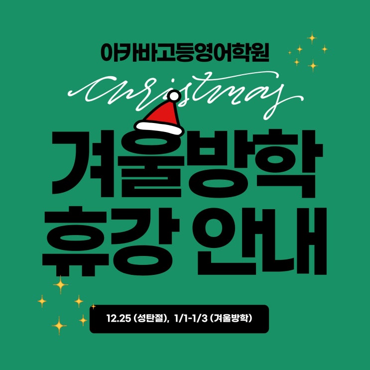 안녕하세요 아카바 고등원입니다. 12월 25일(크리스마스) 와 1월 1일 - 1월 3일(겨울방학)은 전체 휴강임을 안내드립니다. 휴강 기간에는 방문 및 전화상담을 포함해 모든 수업이 진행되지 않으니 이 점 양해 부탁드리겠습니다. 한 해 동안 저희 아카바에 보내주신 관심과 신뢰에 진심으로 감사드립니다. 다가오는 새해에도 변함없이 학생 한 명 한 명의 성장을 위해 더 깊이 고민하고, 더 성실히 지도하겠습니다. 감사합니다. 문의) 053-753-6616 <img src="https://blogthumb.pstatic.net/MjAyNTEyMjBfMjM4/MDAxNzY2MTk5MDk1MjMz.HyRRxzoBD6ehQp0bZThE4XUsqviiOF5AneRLVGUq-Ckg.LYQ7qE5Tmh0Nmxq1nH6W4-imNOcF73AGKJCdx9DaP0Eg.JPEG/%C1%A6%B8%F1%C0%BB_%C0%D4%B7%C2%C7%D8%C1%D6%BC%BC%BF%E4._%2825%29.jpg?type=s3" />