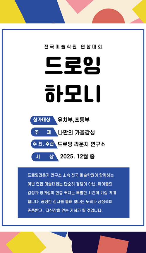 안녕하세요.^^ 아트버니 원장 김지윤 입니다♥ 가을이 깊어가는 11월, 아트버니가 함께하는 드로잉라운지 미술연구소에서는 전국의 미술학원 아이들이 참여하는 연합 미술대회가 열립니다. 아이의 성장을 응원하는 무대, 연합미술대회가 주는 진짜 힘! 제가 늘 지향하는 대회의 의미는 단순히 그림을 잘 그리는 아이를 뽑는 자리가 아닌, 아이들의 마음과 성장을 응원하는 ‘과정의 아름다움’을 함께 보는 축제의 무대가 되길 바라는 것입니다. 그래서 아트버니는 그동안 대회 참여에 있어 늘 신중했습니다. 그림 실력만을 평가하고, 학원 홍보나 상 중심으로 운영되는 일반적인 대회에서는 정말 아이가 성장할 수 있는 경험인지 늘 고민될 수밖....... <img src="https://blogthumb.pstatic.net/MjAyNTExMjZfMjU4/MDAxNzY0MTEzODc0NTYz.LmsLY9wZi0tIMXwFkNY5s0w4aMeh2oq_IZpA7CfA4lgg.pOQ5RJ9aGNpkQVvBnCVgvNKAYluhpTUryra1vRDhKj0g.PNG/image.png?type=s3" />