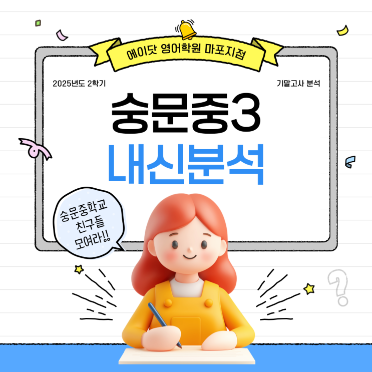 안녕하세요 에이닷 영어학원 마포지점입니다 날이 점점 추워지는 요즘, 다들 감기 걸리지 않게 따뜻하게 입고, 건강 조심하세요!! 오늘은 숭문중 3학년 2학기 기말고사 분석을 준비했습니다! 어떤 주목할만한 포인트가 있는지 알아보겠습니다. 이번 시험의 시험범위는 교과서로 이루어져 있었습니다. 총 24문항 중, 교과서에서 출제된 문항은 23개, 외부지문 1개로 교과서에서 중점적으로 출제되는 경향을 보였습니다. 객관식 문제의 배점은 70점, 서술형 문제의 배점은 30점으로 객관식 문항이 중점적으로 출제되는 것을 알 수 있습니다. 또한, 지문의 문장이나 어법 등이 변형된 문항이 13개, 53점으로 변형 문항이 많이 출....... <img src="https://blogthumb.pstatic.net/MjAyNTExMjhfMjQ2/MDAxNzY0MzI4NTE1MTkw.mt1yU3jc2gQx-wQ6lYWNalirJYxnlZ0D14RtRuy0Lucg.wcftxMwsrxXQgcxKLKbbRmU8PK_fdNy6-UmVPQ6EaUUg.PNG/003.png?type=s3" />
