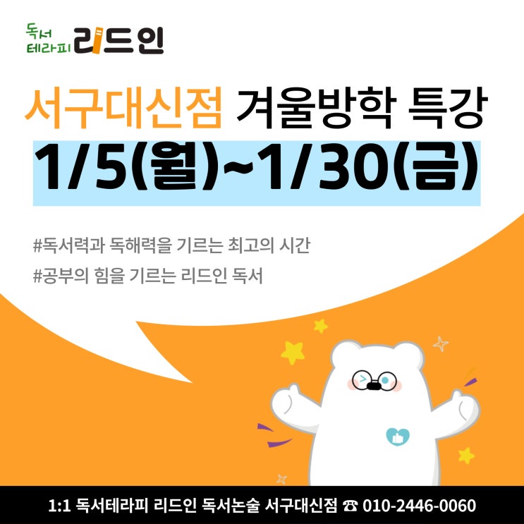 독서가 실력의 기준이 되는 시대, 겨울방학이 기회입니다. 겨울방학은 아이의 학습 능력을 키우기에 가장 좋은 시즌입니다. 학교 수업 부담이 줄어드는 시기이기 때문에, 평소 하지 못했던 독해력·어휘력·사고력 강화, 즉 학습의 ‘기초 체력’을 만드는 데 최적의 시간입니다. 특히 요즘 학교 시험과 서술형 평가, 그리고 모든 과목의 문제 이해도는 독서능력과 독해력에 따라 점수가 갈리는 경우가 많습니다. 그래서 많은 부모님들이 겨울방학 독서 프로그램, 독서 논술학원 추천, 리드인독서논술을 찾는 이유이기도 합니다. 리드인 독서논술 서구대신점은 겨울방학 동안 아이의 읽기 기반을 단단하게 다지고, 스스로 사고하고 이해하는 힘을 키....... <img src="https://blogthumb.pstatic.net/MjAyNTEyMDlfMTYx/MDAxNzY1MjY3Nzk4MTg1.caX6CsO9_BDY3CnXWxhFigRTos4B544lTjEVxNrcU7wg.05TOHJXBHH_bKTLrn1pplkPizHQSO8bL-YpUlXbinOkg.JPEG/%B8%AE%B5%E5%C0%CE%B9%E6%C7%D0%C6%AF%B0%AD-001.jpg?type=s3" />