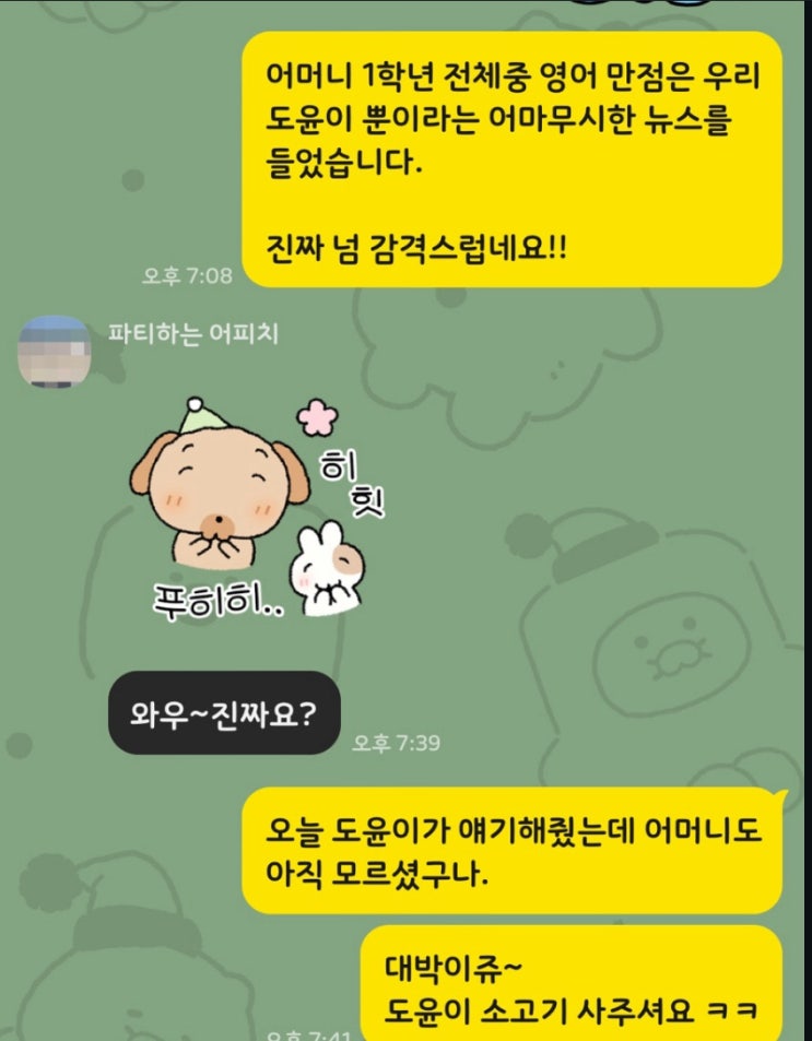 안녕하세요! 행복한 강쌤입니다 기말고사 막바지 준비로 너무 바빠서 포스팅을 최근 못했었는데. . 오늘은 진짜 #어메이징뉴스 를 가지고 왔어요! 안쓸수가 없었어요! 이런건 꼭 알려야쥬~ 능주중 1학년 우리 도윤이(김도윤)! 중간고사때도 영어가 100점이었는데, 기말고사에도 또 100점! 연속해서 100점 받아오는것도 대단한데, 1학년 전체에서 혼자 만점이라는게 더 대박! 와~ 정말 흥분되는 뉴스였어요! 열심히 지도했고, 잘 따라와준 도윤이에게 너무 고맙네요. 어머니께도 카톡드렸지요. 진짜 대단하다 도윤아 너무너무 자랑스럽고 뿌듯하구나. 어머니께서 사주시는 쇠고기도 맛있게 먹어라! 쌤도 시험마무리하구 선물해줄....... <img src="https://blogthumb.pstatic.net/MjAyNTEyMTBfMjgx/MDAxNzY1MzY3NjQ0NDQx.LYEe3nflyJtgfAdVnYDuuOzP3gGtmBGAvPibSSWIIGEg.87SSJs5XHQKoI4BeMDpauMSWdt2Ix1obhzjnGOBJ9T0g.JPEG/IMG%A3%DF0283.jpg?type=s3" />