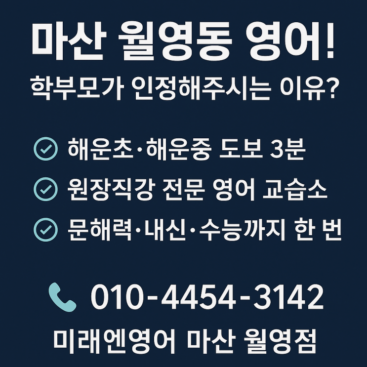 우리 아이 영어, 어디서 시작할까요? 영어는 시작 시기가 빠르다고 무조건 좋은 건 아닙니다. 아이의 현재 수준에 맞춰 체계적인 커리큘럼으로 성장할 수 있는 수업이 중요합니다. 마산 합포구 월영동에서 최근 학부모들이 많이 찾는 곳이 있습니다. 바로 해운초·해운중 인근 원장직강 영어 교습소입니다. 대형 학원? 이젠 원장직강 교습소입니다. 예전에는 브랜드 큰 학원이 더 믿을 수 있다고 여겼지만, 요즘은 아이에게 집중 지도가 가능한 곳, 즉 원장님이 직접 수업하는 영어 교습소를 더 선호하는 추세입니다. 상담 때마다 학부모님들이 하시는 말씀이 있습니다. “대형 학원인데 피드백이 없어요.” “숙제를 내줘도 확인을 안 해줘요.”....... <img src="https://blogthumb.pstatic.net/MjAyNTEyMDhfODIg/MDAxNzY1MTQ1MDc5MTk5.PBom0YEVA1obINIq7qqQ2GtDLgEnYW0d_8fM-xwDrIog.lJsYIqZ0qxntrJ0Cz4XNDn9SuYgUelZXjnikFt65MZgg.PNG/555555.png?type=s3" />