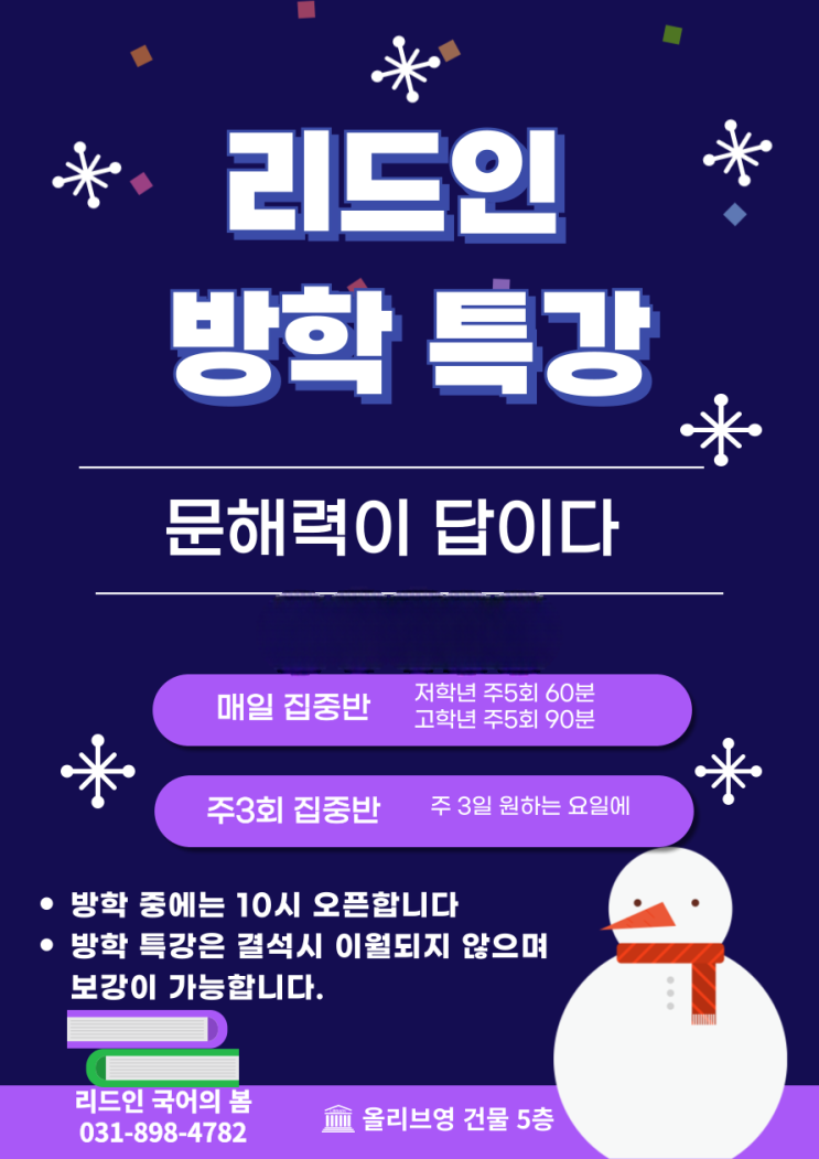 긴긴 겨울 방학이 시작됩니다. 방학은 우리 아이들이 한 단계 성장할 수 있는 정말 귀한 시간입니다. 방학동안 집에서 잘 먹고 잘 쉰 아이들은 키가 한 뼘씩 자라겠구요. 방학동안 학원에서 하루를 보낸 아이들은 학습능력이 한 단계 레벨업 되겠지요. 그런데 어머님 가장 중요한 건 독서입니다. 읽을 수 있어야 수학도 이해하고 과학도 이해하고 영어도 잘합니다. 독서를 통해 배경지식도 쌓고 자기만의 생각을 갖는 판단력을 키워야 문제해결력이 길러집니다. 방학동안 책 읽기 시키세요. 리드인에서요. 문의전화 : 010-4232-2121 <img src="https://blogthumb.pstatic.net/MjAyNTEyMDFfMTYg/MDAxNzY0NTcxMTkyNjYz.PWaSTBncCezP4T0yamXKxfja6Oq-FHbQpLQQkd_WweMg.5n0F4Jj-vQOThQ3OKKpbsJZDQHqdA28Sukn01KzQzMUg.PNG/2025%B8%AE%B5%E5%C0%CE-%B9%E6%C7%D0%C6%AF%B0%AD.png?type=s3" />