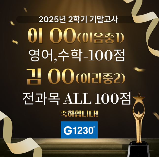 평균이 떨어진 중1 수학 기말! 극강의 난이도! G1230은 수학 100점으로 빛났습니다. 시험은 단순히 점수를 매기는 자리가 아닙니다. 학생이 자기 자신을 만나는 자리이며, 그 과정에서 삶을 배우는 자리입니다. 이번 기말고사는 난이도가 높았습니다. 평면도형과 입체도형 단원은 학생들에게 늘 쉽지 않은 벽으로 다가옵니다. 도형의 성질을 이해하고, 그 속에서 규칙을 발견하는 일은 단순한 계산을 넘어서는 사고를 요구합니다. 게다가 중간고사가 평이하게 출제되면서 학교 전체 평균이 높아졌습니다. 그만큼 기말은 반드시 난이도를 높여야 한다는 학교 분위기가 있었습니다. 그 결과 전교생 500명 가까운 학생들 가운데 수학 100점을 받은 학....... <img src="https://blogthumb.pstatic.net/MjAyNTEyMThfMjA4/MDAxNzY2MDQ1MzMxNDI1.E4E0-NVN6csXc-qZpWmt2WOODBVk7vvTjuWoXHEarCsg.dE6JXhWYnmEk3vw3q1NL2RV5BYKUoW1sPgUGFvyLdxEg.PNG/image.png?type=s3" />