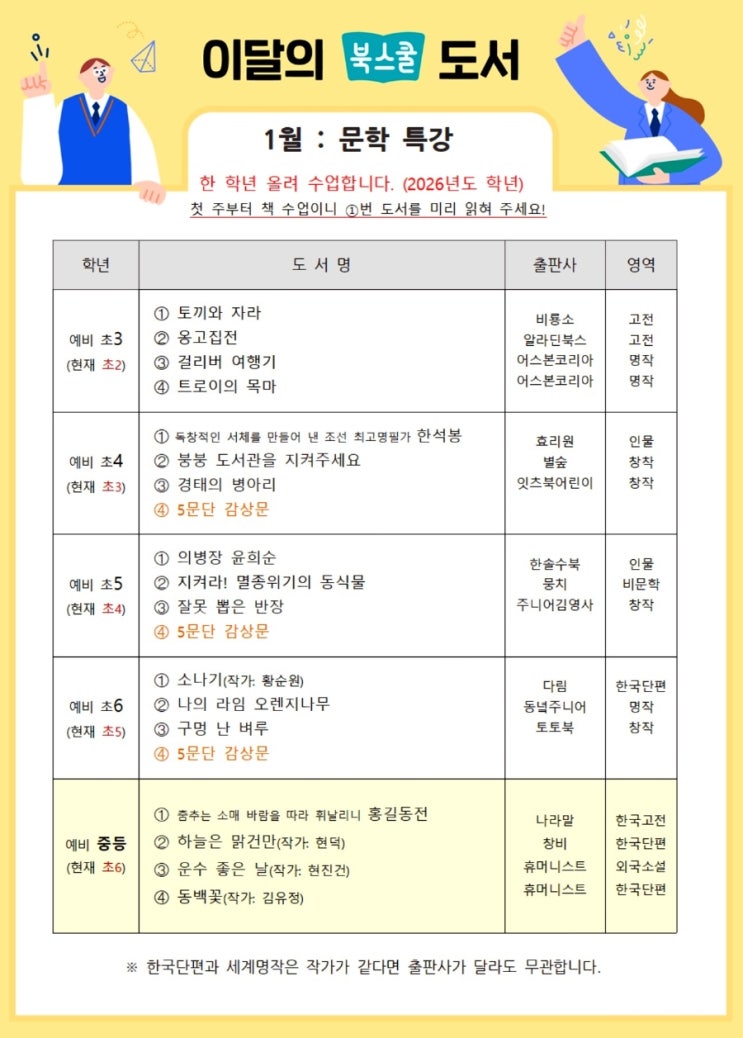 안녕하세요! 해와나무 북스쿨(초3~중등 독서논술)입니다^^ 겨울방학에는 다음 학년의 교과서 수록•과목 연계 도서를 읽으며 2026년을 준비합니다. 1월의 주제는 [문학]입니다. 1. 문학특강은 기존 수강자를 대상으로 합니다. 2. 북스쿨은 해와나무 학원 3층에서 이루어집니다. 3. 학년별 수업 도서를 미리 준비해 주세요. 새해에도 사랑으로 지도하겠습니다. ♀️수업 문의는 평일 월~금 오후 1시~3시에 부탁드립니다. 051) 628-8898 감사합니다. <img src="https://blogthumb.pstatic.net/MjAyNTEyMTdfNjgg/MDAxNzY1OTA2NzQyOTM3.98oDFV3cgUDSc9L3sH3T3Gs_QAmjfKwyX8M5x3E-wRcg.YqqKAFO34m9OrIdueLVizFrei4yaeKnUDA6C29T01bEg.JPEG/900%A3%DF1765905817358.jpg?type=s3" />