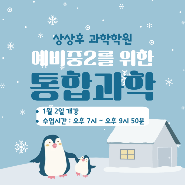 겨울방학은 중등 과학의 기초를 다지기 가장 좋은 시기입니다. 상상후 과학학원에서는 예비 중2 학생을 위한 통합과학 특강을 진행합니다. 전공별 선생님 지도, 개념 정리 워크북 제공, 주중 클리닉 수업(개별관리, 보충)으로 개념 이해부터 문제 적용까지 확실하게 잡아줍니다. 개강 : 1월 2일 수업 시간 : 오후 7시 ~ 오후 9시 50분 통합과학 330,000 <img src="https://blogthumb.pstatic.net/MjAyNTEyMThfNzkg/MDAxNzY2MDUwODYwNzEw.netGZHs0Qg4SNwLs_t4MpExNrp_O7s4MjQH5JaSQGxkg.nnqotHuHWXR4yMlIZrZzEoO8yv-gk9kFOkjnq5weBvsg.PNG/%C1%A6%B8%F1%C0%BB_%C0%D4%B7%C2%C7%D8%C1%D6%BC%BC%BF%E4._%285%29.png?type=s3" />