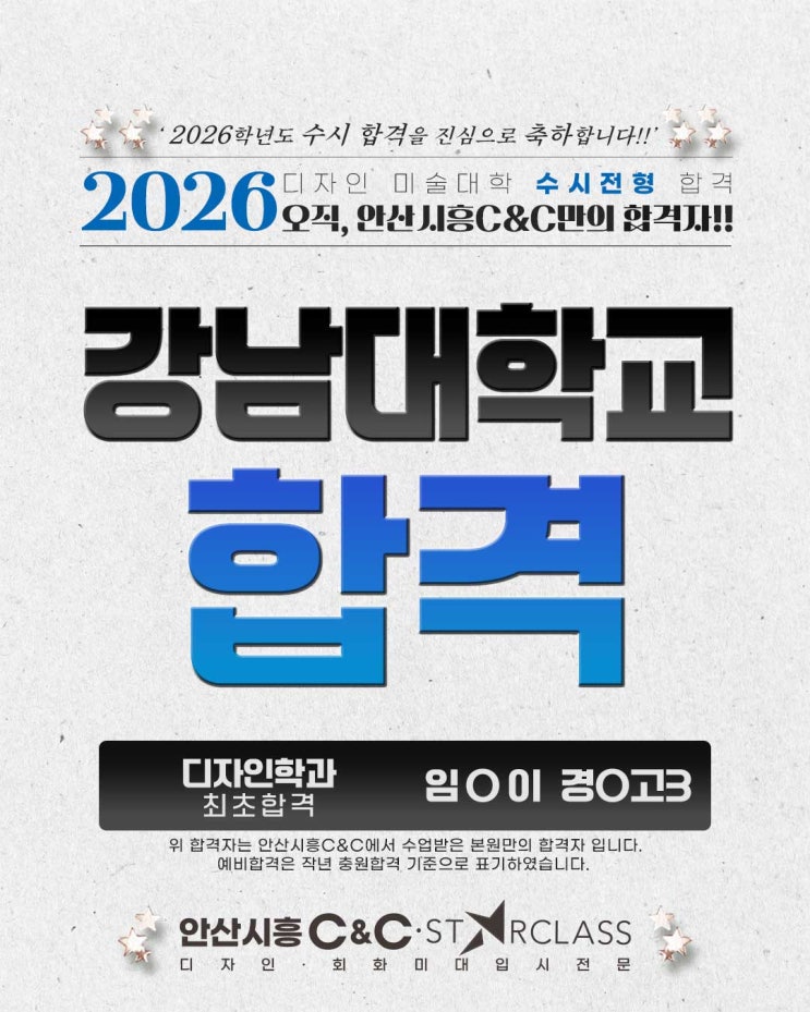 2026 안산 미술학원 C&C 안녕하세요 입시미술 전문 " 안산 씨앤씨 미술학원 "입니다. 오늘 소개해 드릴 내용은 바로바로!! 강남대학교 2026학년도 수시전형 최초합격 소식입니다~ ! 강남대학교 실기우수자 전형반영비는 학생부 40% 실기60% 높은 실기력으로 합격을 가리는 학교입니다 26학년도 강남대 디자인학과 경쟁률 9.14:1 강남대 2026 수시전형 합격!! 강남대 수시 합격자 합격증 안산 미술학원 씨앤씨만의 정식한 합격 결과, 출신학교를 꼭 확인해 주세요. 디자인학과 경 ㅇ 고등학교 임 ㅇ 이 학생 강남대 디자인학과 합격을 진심으로 축하합니다!!! 논 ㅇ 고등학교 강 ㅇ 람 학생 강남대 디자인학과 합격을 진심으로 축하....... <img src="https://blogthumb.pstatic.net/MjAyNTEyMTZfOTMg/MDAxNzY1ODczMzI0MDM3.I4-FesXL3xd3z8Szm2wWyF8XSqlKn9EWzVDjMaJUyA0g.tcqVZm5-rRYbGN2s6vTnOupVgDFwHW28O2ok3CSCbrMg.JPEG/KakaoTalk_20251212_180000289.jpg?type=s3" />