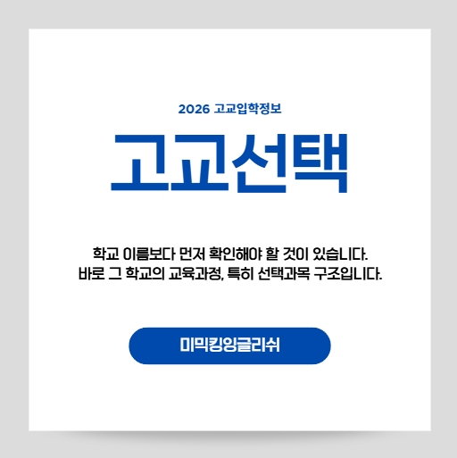 고교 선택, 학교 이름보다 먼저 보셔야 할 것 미믹킹어학원이 입시 상담에서 가장 먼저 확인하는 기준 입시 상담을 하다 보면 “어느 고등학교가 제일 유리한가요?”라는 질문을 가장 많이 받습니다. 하지만 실제로는 학교 이름보다 먼저 확인해야 할 것이 있습니다. 바로 그 학교의 교육과정, 특히 선택과목 구조입니다. 특목고·전국단위 자사고가 안정적인 이유 특목고나 전국단위 자사고가 입시에서 꾸준히 강점을 가지는 이유는 단순히 학생 수준이나 분위기 때문만은 아닙니다. 가장 큰 차이는 선택과목 수와 깊이입니다. 일반적으로 일반고는 수학 5~6과목, 과학 8~9과목 수준인 반면 과학고는 과학 과목만 18~20과목, 전국단위 자사고 역....... <img src="https://blogthumb.pstatic.net/MjAyNTEyMTRfMjQx/MDAxNzY1NzAxNzkxOTQ2.4NteNQja5rgKtfRUKiyTGA5oyOw7LA9Ors9QYYX7vY8g.Nd5ent6bUldkR9vLYtYqU0CE211snqI5cYWqACUOrwQg.JPEG/1.jpg?type=s3" />