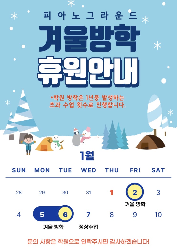 망포동 잠원초 피아노학원 | 피아노그라운드 겨울방학 & 공휴일 안내