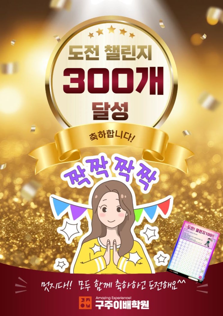 안녕하세요! 구주이배학원입니다. 우리 구주이배 초등 친구들을 위한 칭찬도장《도전! 챌린지100》이 진행중 입니다. (혹시~ 아직 도전 챌린지 관련해서 모르시는 분들은 아래 링크 클릭!!) ↓ https://blog.naver.com/ggoojoo/223722674854 이렇게 우리 학생들의 학습 능력 향상을 위한 도전 챌린지 이벤트도 진행중인데요~ 지금까지 100,200 달성자 까지 나왔는데 드디어 이번에 첫!! 300개 달성자가 나왔습니다!! 저희는 도장을 모을때마다 100개 단위로 정말 푸짐한 상품이 준비 되어있는데요~ 이번 300개 달성은 과연 어떤 선물이 나갈지, 후기까지 함께 기대해주세요! ✨ <img src="https://blogthumb.pstatic.net/MjAyNTEyMTJfMjkw/MDAxNzY1NTIzMzE5Mjg0.2GvGYkimAw1dKmmIYAqo4UoxZltq0tm_Y1YY_xyIX_kg.sgF9P8Ap0nlvYrGtBcM-ZswGntk-2EteX2rlij2YP6gg.JPEG/%B5%B5%C3%B5_%C3%A7%B8%B0%C1%F6_300_%BA%ED%B7%CE%B1%D7.jpg?type=s3" />