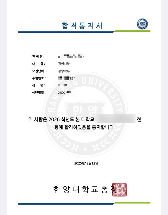 [합격후기] 2026학년도 한양대학교 합격을 축하합니다