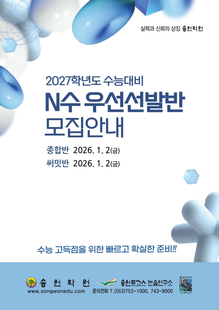 안녕하세요, 송원학원입니다:) 기나긴 입시의 여정 속에서 치열하게 수능을 준비했을 수험생 여러분들, 그동안 고생 많으셨습니다. 오늘은 다음의 선택을 준비하고 있을 N수생을 위해 2027 수능 대비 맞춤형 우선선발반 모집 안내를 드리겠습니다. 2027 대입 수능에서 고득점을 목표로 하고 있는 N수생이라면 놓치지 마세요! 대구 송원학원 2027 수능 대비 N수 우선선발반 모집 안내 12월은 새로운 시작을 준비하기 위해 다시 방향을 설계하는 시점이기도 합니다. 전략적인 접근을 통해 빠르게 상위권 궤도로 진입하시길 바랍니다. N수 우선선발반 자세히 보기 하단 배너 클릭 시 연결됩니다! <img src="https://blogthumb.pstatic.net/MjAyNTEyMTZfMTQx/MDAxNzY1ODQ4NDA3Mzk1.AXEmXtZmzHT6aW0WeyXLZhJrIikNezI_iBkFQDE_XF8g.y-PNCGUVu_V1P0nqOJjPqBU5NNB9_zNvR9m8bQSrBDUg.JPEG/2027_N%BC%F6%BF%EC%BC%B1%BC%B1%B9%DF%B9%DD_%C3%A5%C0%DA-%C3%D6%C1%BE%BC%F6%C1%A4_1.jpg?type=s3" />