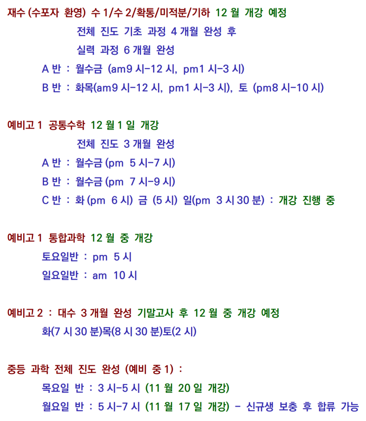(예비중1, 예비고1,고2,) (재수생) 2025년 11월/12월 진행 또는 예정 시간표