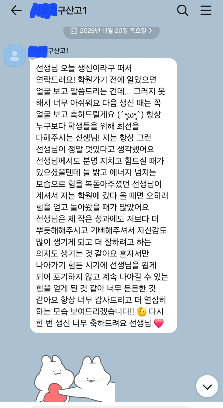 한동안, 고3 입시생들 신경쓰랴, 기말고사 신경쓰랴.. 우리 원생들 성적올리려고, 주말도 없이 쉴틈없이 달려왔더니, 체력이 바닥 났는가봐요. 몸도 마음도 지치고, 감기 몸살까지 겹쳐 아침에 겨우 몸을 일으킬 정도였어요. 토요일은 보강하더라도, 일요일 하루는 쉴까하다가도, 오늘 하루만 더 봐주면, 우리 원생들 수학점수가 바뀔 수 있다는 믿음으로 약 먹으면서 버티고 기말고사를 같이 준비하고 있어요. 생일이 뭐 대순가 싶어, 대충 생각도 없이 보내고 있었는데, 이렇게 고맙고, 사랑스러운 메시지가 와 있네요. 처음, 학생들을 가르칠때 다짐했던 일들이 소록소록 떠올라요. 길잡이가 되는 선생님이 되자! 멋진 선생님이 되자! 그 믿음....... <img src="https://blogthumb.pstatic.net/MjAyNTEyMDNfMjE1/MDAxNzY0NzM0NDc3NDkx.2nRKbFupd_MUlYMhZz9v4LM4moOh-lM00G71CRuyZiYg.9_o3sUy-qMul4mtne1T30o8aCpdq4NBadem0MFAOlJIg.PNG/image.png?type=s3" />