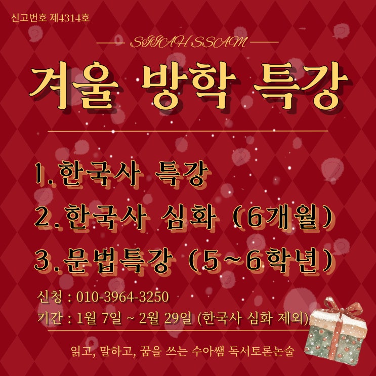 수아쌤 논술 겨울 방학 특강 안내/ 산성초 겨울방학도 수아쌤과 함께하세요.
