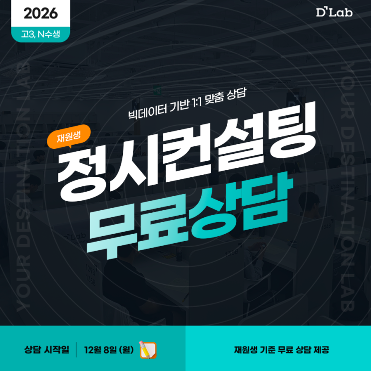 안녕하세요! 대성학원이 만든 독학재수학원, 디랩입니다. 12월은 수험생들에게 무엇보다 중요한 시기입니다. 수능이 끝난 후, ‘어디에 지원해야 하는가?’가 최종 결과를 좌우하는 시기이기 때문이죠. 특히, 정시는 단순히 성적만으로 결정되는 것이 아니라 전략, 조합, 학과 선택 등 여러 요소가 맞물려 있어 전문적인 분석과 상담이 필수입니다. 디랩에서는 12월 8일부터 정시컨설팅을 본격적으로 시작하여 학생 개개인의 성적과 목표, 지원 가능성에 따라 정확한 전략을 세울 수 있도록 전문 상담을 진행하고 있습니다. 재원생 기준 무료로 제공되는 디랩만의 정시컨설팅은 1년 동안 학생의 학습 흐름과 강약점을 가장 잘 이해하고 있는 담임....... <img src="https://blogthumb.pstatic.net/MjAyNTEyMDlfMjA0/MDAxNzY1MjcxNjQ5NTM2.VtzWMSrbx2h0obZb-1Hl28ngBgvejUSIWCfGspC5geog.Laz428kc8wwriJ4fg9UKEXdXmofYLUdLOdTFLLHPBdwg.PNG/%BD%E6%B3%D7%C0%CF_%B5%F0%B7%A6_%C1%A4%BD%C3%C4%C1%BC%B3%C6%C3_%B9%AB%B7%E1%BB%F3%B4%E3.png?type=s3" />
