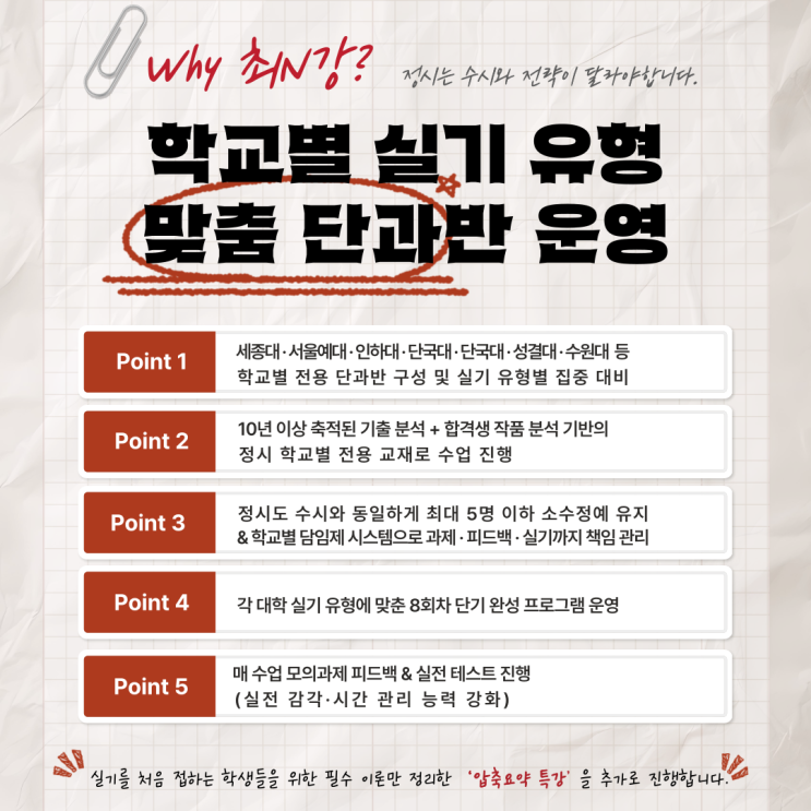 안녕하세요. 최N강 영화학원입니다. 먼저, 수시 준비를 위해 마음과 시간을 다해주신 수험생 여러분께 진심으로 수고했다는 말을 전하고 싶습니다. 결과를 기다리는 과정에서, 혹은 이미 결과를 받아든 지금 여러 감정이 교차하고 있을 여러분의 마음을 잘 알고 있습니다. 특히 이번 수시에서 원하는 결과를 얻지 못해 마음이 무거운 친구들이 있다면 따뜻한 위로와 응원의 말을 전하고 싶습니다. 하지만 아직 정시 전형이라는 중요한 기회가 남아 있습니다. 끝날 때까지 끝난 게 아닙니다. 지금부터 다시 준비해도 충분히 달라질 수 있습니다. 수시에서 아쉬운 결과를 받았지만 정시에서 역전한 친구들의 사례는 매년 이어지고 있습니다. 포기하....... <img src="https://blogthumb.pstatic.net/MjAyNTExMTRfNTQg/MDAxNzYzMTA3MjEzNzU0.hq0NilwrZtro_fy9mu4YupfsjgsbPk3VvUoVw-U9aM0g.TedgjWXkbPi_lQgOlzVk1o4U_E4CUOYaHRH7pTO_Qjwg.PNG/%C1%A6%B8%F1%C0%BB-%C0%D4%B7%C2%C7%D8%C1%D6%BC%BC%BF%E4_-007_%285%29.png?type=s3" />