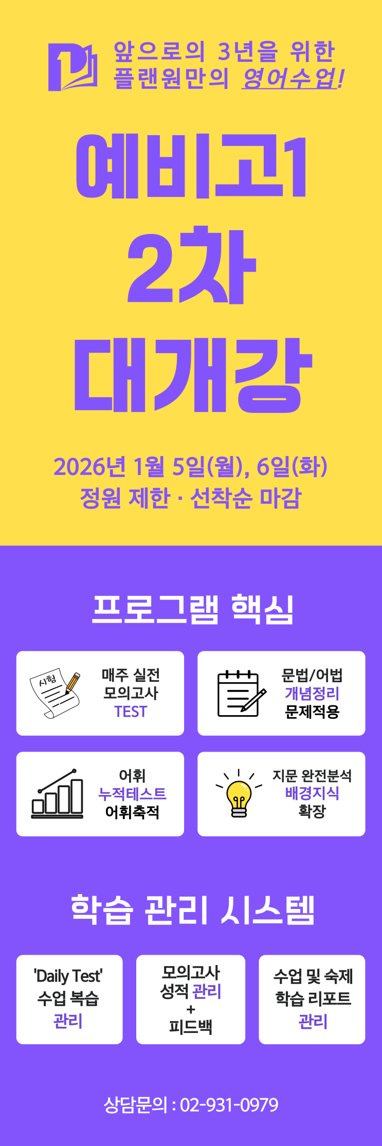 “우리 아이가 이번에는 꼭 자신감을 되찾았으면 좋겠어요.” 재수라는 선택은 단순히 ‘한 해 더 공부’가 아니라, 올바른 방향과 관리가 있는 1년이 되어야 합니다. 대치비상에듀학원은 국어·수학·영어·탐구·논술 전 과목을 소수정예·맞춤형·관리형 시스템으로 운영하며, 학생 한 명 한 명의 학습 리듬과 심리적 안정까지 함께 관리합니다. 🎯 1. 8명 이하 소수정예 – 개인 수준에 맞춘 맞춤 수업 학생 개개인의 학습 수준과 성향을 정확히 진단하여 국어·수학·영어·탐구 전 과목 수준별 반편성으로 수업을 진행합니다. 단순히 진도만 나가는 강의식 수업이 아닌, 학생이 정확히 이해하고, 문제를 스스로 풀어낼 수 있도록 강사가 밀착 지도합니다. 소수정예의 장점은 바로 “관심의 밀도”입니다. 대치비상에듀는 학생 한 명도 놓치지 않습니다. 🔍 2. 담임제 1:1 학습관리 – 매일, 그리고 꾸준히 대치비상에듀학원은 전담 담임 시스템을 통해 매일 학습 진도, 생활 패턴, 성적 변화를 점검합니다. 주간 단위로 학부모님께 학습 리포트를 전달하여 아이의 학습 현황을 투명하게 공유드립니다. “아이의 공부가 눈에 보이는 학원” 이것이 대치비상 관리형 시스템의 핵심입니다. 🌱 3. 논술·탐구까지 완벽 대비 수능 이후 논술까지 대비하는 학생들을 위해 대학별 기출 분석 → 첨삭 피드백 → 실전 대비의 전 과정을 전문 강사진이 직접 지도합니다. 탐구 영역도 개인별 약점 분석을 기반으로 복습 루틴과 오답 관리 프로그램이 운영됩니다. 🌱 4. ‘공부 관리’가 아닌 ‘성장 관리’ 재수 생활은 단순히 공부의 반복이 아닙니다. 심리적 안정과 루틴의 확립이 함께 이루어져야 끝까지 집중할 수 있습니다. 대치비상은 학생이 흔들리지 않도록 멘토링·생활관리·학습코칭을 통합 운영하여 “끝까지 버티는 힘”을 만들어 줍니다. 🏆 5. 이런 학생에게 적합합니다 혼자 공부하며 방향을 잡기 어려웠던 학생 대형 학원에서 관리받기 힘들었던 학생 학습 리듬이 불규칙하거나, 슬럼프가 있었던 학생 논술까지 체계적으로 준비하고 싶은 인문/자연계 재수생 📍 대치비상에듀학원 수능은 ‘혼자의 싸움’이지만, 재수는 ‘함께 가는 과정’입니다. 대치비상은 학생의 가능성을 끝까지 지켜보며 그 길을 함께 걷는 든든한 동반자가 되겠습니다. 📞 상담문의: 02-525-2599 📍 위치: 서울 강남구 대치동 (롯데백화점 3번GATE앞) 🕓 상담 예약: 1:1 맞춤 상담 사전예약제