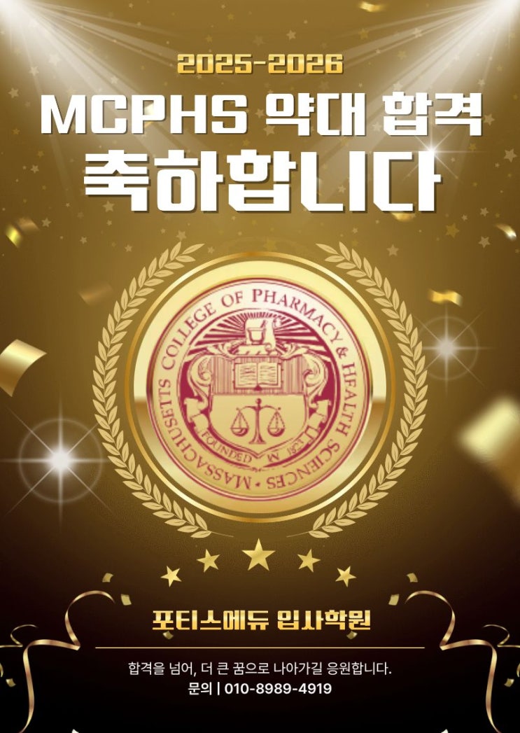 안녕하세요 포티스에듀 민지쌤입니다! 날씨가 많이 추워져 곧 크리스마스가 다가오는게 한층 더 실감이 납니다! 이제부터는 내년 미국대학을 지원하는 친구들이 하나둘씩 EA / ED / REA 결과들을 받아보고 있어요~ 오늘 아침에 받은 기분좋은 소식들을 같이 셰어 해드리려고합니다! 미국에서도 2번째로 제일 오래된 약대인 MCPHS 합격소식인데요! 저희 모든 학생들은 이번에 Doctor of Pharmacy (PharmD)로 지원을 했고 오늘 합격 발표가 났습니다! #1 학생 : 윤 * * 위 학생 같은 경우에는, EA I으로 지원을 하게 되어 Presidential Scholarship 연간 $26,200 를 받게 되었습니다. (총 6년 과정으로 토탈 $157,200) #2 학생 : 황 ** 윗 학생 또....... <img src="https://blogthumb.pstatic.net/MjAyNTEyMTFfNDIg/MDAxNzY1NDU5NzMyNjc2.DNQIH0gPeUSMlYIS0DlI_YJJ6AFX9C8JAxEJTs9c75kg.yTYA_cIWR0ouWac07IV61UrGBjCuteMN8WjCodRvKHUg.JPEG/2025-2026_%C7%D5%B0%DD.jpg?type=s3" />