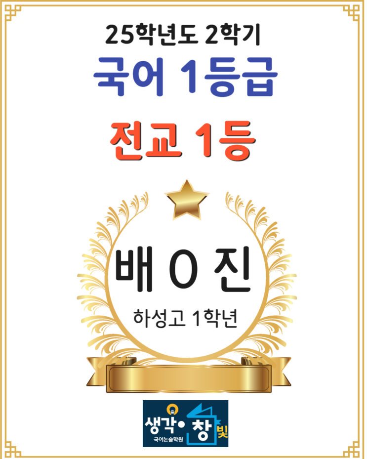 25년 2학기 고등 시험도 마무리되어 가네요. 오늘 하성고에서 중간고사에 이어 기말고사에서도 전교 1등을 했다는 반가운 소식이 전해져왔습니다. 매학기 각 학교에서 전교 1등이 나오는 생각창빛국어학원. 중간고사, 기말고사는 물론 수행평가까지 모두 합해서 전교 1등을 한 것이라 더 의미가 큰 것 같습니다. 각 학교마다 시험경향이 다르지만 생각창빛은 학교별 맞춤형 수업을 실시하고 있습니다. 대규모의 강의보다는 소수정예를 지향하는 생각창빛의 교육은 내신대비와 수능을 연계한 교육에 적합한 수업을 진행하고 있습니다. 다른 학교에서도 계속해서 좋은 소식이 들려오기를 바랍니다~~ **진은 신곡중을 다니는 동안 한번도 국어학원을....... <img src="https://blogthumb.pstatic.net/MjAyNTEyMTdfMSAg/MDAxNzY1OTY2OTk2NTg0.pGbgdQHaCqL5NMfEa2Od1Bj6SFLDhwH-W1v5ca8PYeYg.DTfaKrzjPslVPK9V6DB0bKHnA6N6PJpVn_Vyf059Gg0g.PNG/25-2_1%B5%EE%B1%DE_%C0%FC%B1%B31%B5%EE%28%B9%E8%C0%AF%C1%F8%29.png?type=s3" />
