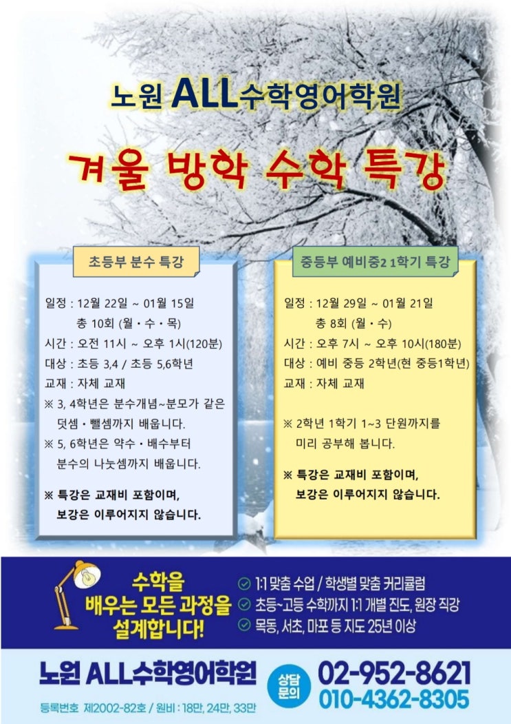 조금 늦게 올라왔네요 노원올수학영어학원 방학 특강 입니다! 이번 방학을은 수학만 방학특강을 계획하고 있습니다 초등은 분수특강을 3,4학년용과 5,6학년용을 따로 준비했으며 1회당 120분 총 10회이며 날짜는 12월 22, 24, 29, 31 2026년 1월 5,7,8,12,14,15일까지 오전 11시 입니다. 3,4학년은 분수개념~분모가 같은 분수의 덧셈과 뺄셈까지 5,6학년은 약수 배수부터 분수의 곱셈,나눗셈까지 6학년과정 연산까지 공부해봄을 목표로 계획하고 있습니다. 중등부는 예비 중2를 위해 총 8회 180분 3시간씩 저녁 7시~10시까지이며 수업 날짜는 12월 29, 31, 2026년 1월 5, 7, 12, 14, 19, 21 일 1단원~3단원까지 공부함을 목표로 알차게 준비하였....... <img src="https://blogthumb.pstatic.net/MjAyNTEyMDlfMTY0/MDAxNzY1MjU5NDI2MTEz.uo0_79oYkPz2cwME4RtHKSLiSbOEt11bxUgX3bz8Vs4g.GFVGHQu9CmXIsQLlxufSZGTqcPBbXLLloJfuKoMrZVIg.JPEG/%B3%EB%BF%F8%C7%D0%BF%F8%B9%E6%C6%AF.jpg?type=s3" />