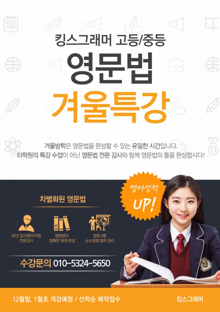 킹스그래머 어법겨울특강 12월 마지막 주 부터 킹스그래머 어법특강이 시작됩니다. 주 2회 (월수반, 화목반) 8주 완성 예정입니다. 중등기본, 중등고급, 예비고등 3개의 레벨로 개설되며 테스트를 통해 반을 편성하게 됩니다. 독해와 어휘를 보강하기 위해 매주 1시간씩 독해/어휘 클리닉 시간이 추가됩니다. 마감이 임박한 반이 많습니다. 상담문자 주시면 편하신 시간에 연락드리겠습니다. <img src="https://blogthumb.pstatic.net/MjAyNTEyMTFfNjYg/MDAxNzY1NDQ2Mjk3NTA0.63s4YLRqWWEPv3DZi8l5SMp5YzXMr3XkGSiuvTui5rYg.0lQU5USOVunm23PhEIFeat9ODnNRc9jLwbx6_kk6ITQg.JPEG/%B0%DC%BF%EF%BF%B5%B9%AE%B9%FD-001.jpg?type=s3" />