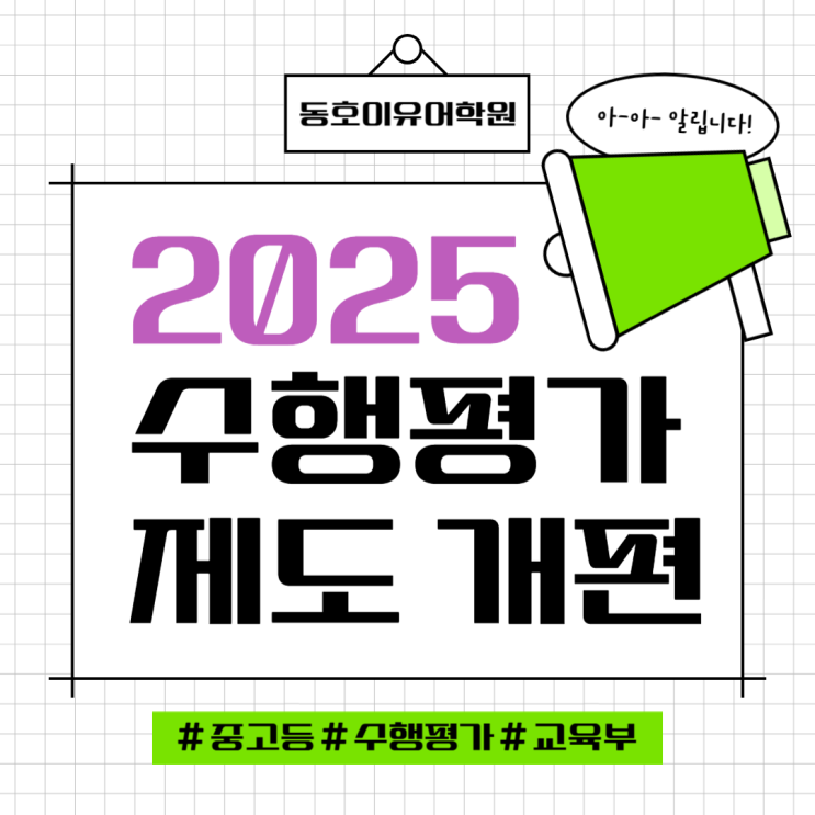 안녕하세요 동호이유어학원입니다 2학기부터 중고등학교에서 수행평가 방식이 크게 달라지게 됩니다. 학생들의 부담을 줄이고, 수행평가의 본래의 목적을 제대로 살리도록 개선됩니다 ! 그럼 한번 알아보러 갈까요? [변화되는 것] 1. 모든 수행평가는 수업시간 내에 실시 수행평가는 이제 교실 안에서 진행되는 활동만 포함됩니다. 발표, 토론, 실험 등 실시간으로 진행되는 평가가 허용되고, 수업 외 수행평가는 금지됩니다. 학생들이 수업시간 내에 바로 참여하고 발표하는 능력이 더 중요해지게 됩니다. 2. 과제형 및 암기식 수행평가 배제 부모님 도움을 받을 수 있는 과제형 수행평가가 사라지고, 단순 암기를 요구하는 수행평가도 더....... <img src="https://blogthumb.pstatic.net/MjAyNTEyMTFfNjcg/MDAxNzY1NDQ3NDQ3MzA5.Ld8TCp_w6eDSvNcd4-FgwfwOZpuL6JxF8gART0-fJFAg.ioazf4ZNF1P_hfp9Si6DK0mLATaNBbSU4Yx-KHXMvicg.PNG/%C1%A6%B8%F1%C0%BB_%C0%D4%B7%C2%C7%D8%C1%D6%BC%BC%BF%E4_-004_%281%29.png?type=s3" />
