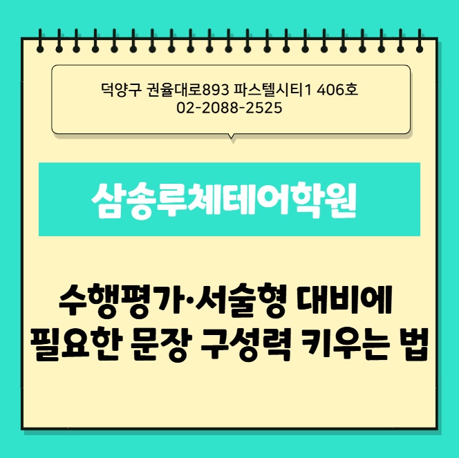 안녕하세요 오금동중등영어학원 삼송루체테어학원 입니다. 중등영어는 수행평가와 서술형 비중이 높아지면서 문장 구성력이 성적의 핵심이 되고 있습니다. 오늘은 중등 시기에 꼭 필요한 문장 구성력 키우는 법을 오금동중등영어학원 삼송루체테어학원에서 함께 정리해보려 합니다. 서술형 문항은 단순 암기로는 절대 대비가 어렵습니다. 문장을 스스로 만들어내는 능력이 요구되기 때문입니다. 이때 중요한 것은 단어보다 ‘문장 구조’입니다. 구조를 알아야 어떤 질문에도 문장을 변형해낼 수 있습니다. 문장 구성의 첫 단계는 핵심 구조 파악입니다. 주어·동사·목적어와 수식어의 위치를 정확하게 구분하는 연습이 필요합니다. 이 기본 틀이....... <img src="https://blogthumb.pstatic.net/MjAyNTEyMTBfMTg1/MDAxNzY1MzM5MTg1MTk0.ZHR5iCbAnvKEQ8izOFDXuOlH79KnVQnJ2xzX-Nm6tLgg.g_rwXtHncsT4PTH9zIxA4xE1ixc5Kd6_K27Yatg7W-wg.JPEG/20251209141903.jpg?type=s3" />