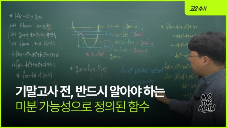 고2 함수 단원에서는 조건에 따라 새롭게 정의되는 함수가 자주 등장합니다. 특히 “미분 가능하지 않은 점의 개수로 정의되는 g(t)” 유형은 기말고사에서 난이도 있는 문제로 출제되는 대표 개념입니다. 이번 영상에서는 단순 공식 암기가 아니라 그래프를 어떻게 해석하고 조건에서 무엇을 읽어내야 하는지 처음부터 끝까지 논리적으로 설명합니다. 이번 영상에서 다루는 핵심 내용 ✔ 1. f(x)−t가 미분 불가능한 점의 개수로 정의된 함수 g(t)의 의미 미분 가능성과 접점 개수를 연결해 해석하는 사고법을 배웁니다. ✔ 2. g(t)가 특정 값에서만 불연속이 되는 이유 왜 t = 5, t = 32에서만 불연속인지, 이 조건이 f(x)의 전....... <img src="https://blogthumb.pstatic.net/MjAyNTEyMDRfMTIy/MDAxNzY0ODE2NTcyNzY2.y78AjgvHujQhfnuZym23gffWPETBVr6CoHuMgcEZKhMg.GViAjC2O0IwlVTxXugYRstWLAy7wXRA533_iNooe7r8g.JPEG/900%A3%DF1764814591264.jpg?type=s3" />