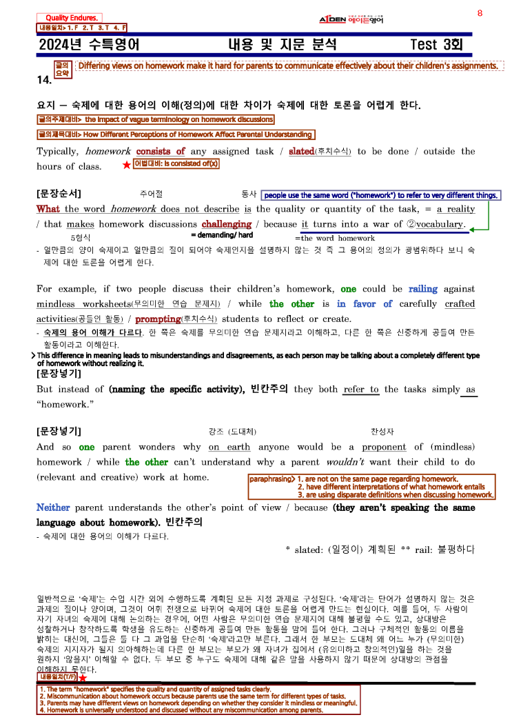 방배동 영어학원 방배파머스영어 지니원장입니다 이번 1~2월 겨울방학 동안 진행되는 초등 고학년 문법·서술형 집중특강 안내드립니다. 📘 매주 월요일 특강 수업 구성 ✔ Grammar 집중 학습 + 서술형 문장 쓰기 ✔ 주 3편 Story Reading & Comprehension Test 매주 월요일은 아이들의 문장 구조 이해력, 리딩 기초 체력, 그리고 서술형 쓰기 능력을 키우는 데 집중하는 날입니다. ■ 특강 수업 내용 안내 1) 문장 구조 분석 (Sentence Structure Analysis) 문장의 1~5형식을 정확히 구분하고, 문장에서의 주어·동사·목적어·보어·수식어 역할을 눈에 보이게 정리합니다. 문장 구조가 보이면 리딩 속도와 정확도, 말하기가 동시에 올라갑니다. 많은 학부모님들이 리딩 속도만 고민하시지만, 실제로는 “문장 구조가 보이느냐”가 실력 향상의 결정적인 지점입니다. 2) TO 부정사 완전 정리 to부정사를 명사처럼 쓰일 때(주어·목적어·보어) 형용사처럼 쓰일 때 부사처럼 쓰일 때 로 나누어 예문과 함께 정확하게 정리합니다. to부정사의 쓰임만 제대로 이해해도 리딩 지문의 이해도와 문장 해석력이 급격하게 달라집니다. 3) 서술형 문장 쓰기 훈련 아이들이 배운 문장 구조·to부정사 개념을 가지고 직접 문장을 변환·확장·재구성해보며 서술형 문장 쓰기를 진행합니다. ✔ 개념 → 구조 → 나만의 문장 만들기 이 흐름이 정확히 잡혀야 중학교 서술형 대비가 완성됩니다. 4) 매주 Story 3편 읽기 + 독해 테스트 주간 숙제는 스토리 3편 읽기이며, 수업 시간에 각 스토리당 5문항의 독해(comprehension) 테스트를 진행합니다. 스토리를 단순히 읽고 끝나는 것이 아니라, 문장 구조와 어휘, 핵심 문장을 다시 잡아주기 때문에 읽기 실력이 훨씬 단단해집니다.