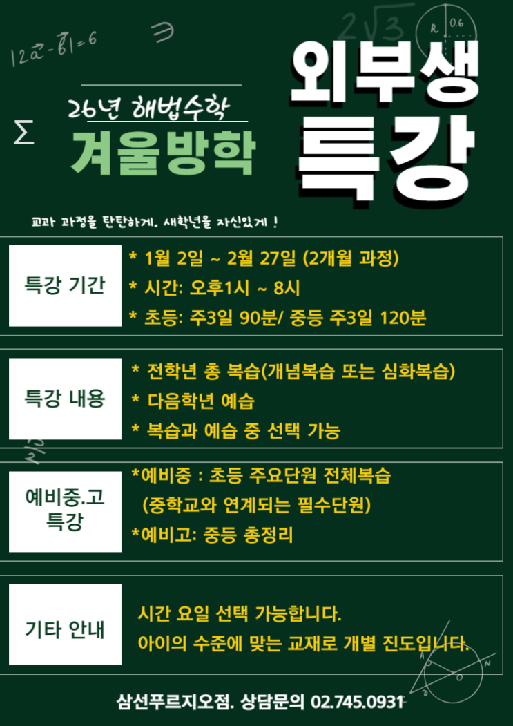 안녕하세요. 해법수학입니다. 삼선푸르지오 해법수학에서는 2026년 겨울방학 외부생 특강을 진행합니다. 겨울 방학은 아이가 지난 학기를 정리하고 새학년을 준비할수 있는 가장 중요한 시기입니다. 학생 개개인의 수준에 맞춰 맞춤형으로 복습 또는 예습이 가능합니다. 부족했던 중요단원을 다지거나 더큰 발전을 위한 복습심화를 통해 한단계 UP~ 해법에서 함께 합니다~~ 언제든 문의 주세요~ 02.745.0931 <img src="https://blogthumb.pstatic.net/MjAyNTEyMTFfMjYw/MDAxNzY1NDMwMDM0NTk4.u-DprVY0Kj0eS8I6l34RidIUbO4UmuEhrTdauMGF52Yg.0X2cJeQ0lMT6DObqvdA7HtRRoDG6nPUpIMIWuheuihcg.PNG/%C1%A6%B8%F1%C0%BB_%C0%D4%B7%C2%C7%D8%C1%D6%BC%BC%BF%E4_-002_%281%29.png?type=s3" />