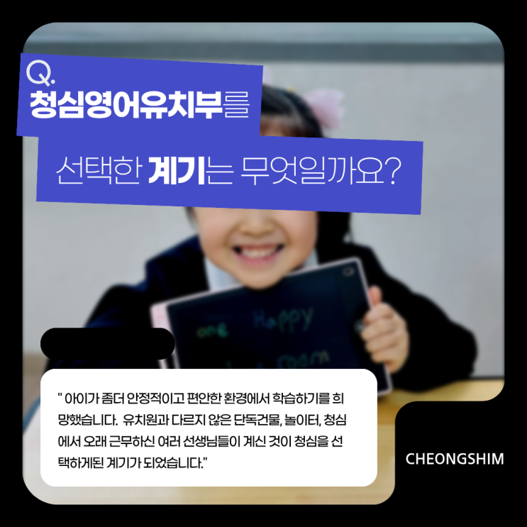 아이가 좀더 안정적이고 편안한 환경에서 학습하기를 희망했습니다. 유치원과 다르지 않은 단독건물, 놀이터, 청심에서 오래 근무하신 여러 선생님들이 계신 것이 청심을 선택하게 된 계기가 되었습니다. 현재 초등학교 1학년, 우O인 학생은 6살때 청심영어유치부에 입학한 이후 연계하여 초등부과정에서도 영어를 학습하고 있습니다. 지난 8월에 실시한 토플 프라이머리 스텝 2에서 고득점을 획득하였는데요. O인이와 더불어 학습적으로 우수한 학생들의 가장 큰 공통점은 어릴때 부터 독서습관이 형성되어 '독서를 꾸준히 한다는 것'입니다. 우O인 학부모님과의 인터뷰 내용을 통해 영어독서 시기, 하루 독서량 등을 확인해 보시기 바....... <img src="https://blogthumb.pstatic.net/MjAyNTExMjRfMjMy/MDAxNzYzOTczOTEzOTAx.oPw2_z47GJKz818oc2E3khekQGbdUrvltUcmxHbJvhMg.g0q7VxeIgZv3ftxzMdKZEVbPSLp0zdWY12gShd3QT20g.PNG/2.png?type=s3" />