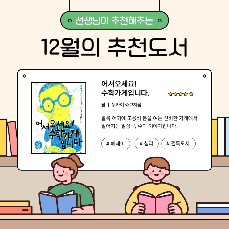 안녕하세요. 생각하는 수학 페르마 방배 캠퍼스입니다. 골목 어귀에 조용히 문을 여는 수학가게 “수학을 잘 못해도 괜찮아. 이 가게에서는 누구든 손님이 될 수 있으니까.” 『어서오세요! 수학가게입니다』는 일상에 지친 어느 날, 골목 어귀에서 문을 연 작은 수학가게를 통해 사람들의 마음과 문제를 따뜻하게 풀어내는 에세이와 수학이 어우러진 감성적인 책입니다. 단순한 계산법이나 문제 풀이가 아니라 ‘수학을 바라보는 태도’와 ‘생각의 방식’을 자연스럽게 되짚어보게 만드는 이야기가 담겨 있습니다. 수학이 따뜻하게 느껴질 때 책 속에는 다음과 같은 질문들이 등장합니다. 왜 우리는 정답만을 원하게 되었을까? 속도가 느리면 틀....... <img src="https://blogthumb.pstatic.net/MjAyNTEyMTFfMjE3/MDAxNzY1NDM3ODk0NTcy.Ep59bbvKFEru0zh0itQjp4IjLCgEgOMe-TW_mJ19KM4g.C3KC-w67TuAjHJP6Oct7UpZz3KliAtvxANPDCZXE5j0g.PNG/12%BF%F9_%C3%DF%C3%B5%B5%B5%BC%AD-001.png?type=s3" />