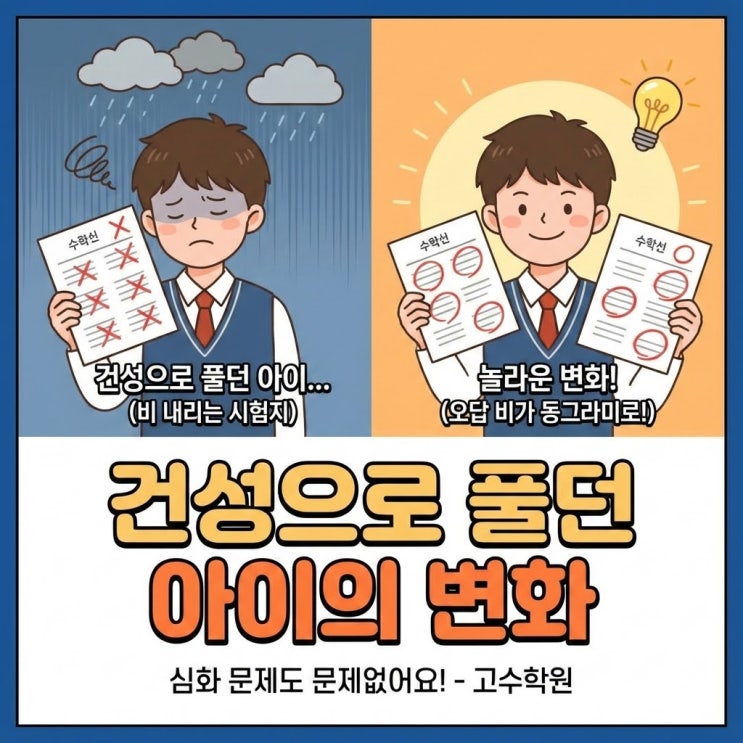 이해를 못 한 것도 아닌데 자꾸 틀린다며 혹시 심화 학습 자체에 문제가 생긴 건 아닌지 걱정하시는 학부모님들이 계십니다. 아무래도 심화 문제 앞에서 "모르겠다"라는 말도 잦아지고 시간만 하염없이 잡고 있는 경우가 많아서 그럴 겁니다. 하지만 정말 유심히 살펴보면 문제를 '건성건성' 푸는 아이인 경우들이 있습니다. 문제를 유심히 읽지 않고 조금만 복잡해 보이면 타당성을 부여하듯 일정 시간 생각하고는 결국 그저 "모르겠다"라는 말을 합니다. 그 결과 채점을 해보면 비가 내리죠. 저희 초등부 학생의 변화를 이야기드려보겠습니다. 건성건성 푸는 학생의 숨겨진 이유 [문제 해결의 길잡이]를 풀리다....... <img src="https://blogthumb.pstatic.net/MjAyNTEyMTNfMjAz/MDAxNzY1NjI1MDgzNzA1.Z6Kb3VoTrWWsU1_txifuOaFUuJPbapnHiblQF8qaxFog.FivcIsEfZ27dimB5KhLAzX3ZIt3sayNLrToC1B4UdNcg.JPEG/unnamed.jpg?type=s3" />