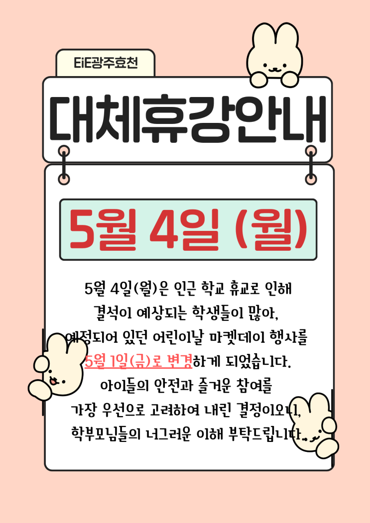 안녕하세요 곧! 아이들이 제일 기대하는 어린이날 입니다 어린이날 마켓데이를 위해 선생님들도 하나하나 정성껏 준비를 이어가고 있습니다. 아이들이 즐겁게 참여하며 좋은 추억을 만들 수 있도록 프로그램 구성부터 세세한 부분까지 꼼꼼히 준비하고 있으며, 가능한 많은 아이들이 함께 웃고 즐길 수 있는 시간이 되도록 최선을 다하고 있습니다. 다만, 5월 4일(월)은 인근 학교 휴교와 주말, 그리고 어린이날까지 이어지는 일정으로 인해 참여가 어려운 학생들이 많을 것으로 예상되어, 부득이하게 어린이날 마켓데이 일정을 5월 1일(금)로 변경하게 되었음을 안내드립니다. 또한 5월 4일(월)은 휴강입니다. 이 점 참고하시어 일정에....... <img src="https://blogthumb.pstatic.net/MjAyNjA0MDZfMTc4/MDAxNzc1NDcwNTA1NTY3.RA4QoZlyx304lFsgyQpn2mx8syefG2MSkGJlZnLIsugg.zfkvgYOEeQI2A1gOlIPwkDRr-rPqoDi9k6ZWpoY51NUg.PNG/%C7%CE%C5%A9%BF%CD_%B9%CE%C6%AE%BB%F6_%B1%CD%BF%A9%BF%EE_%C7%D0%BF%F8_%B0%AD%C0%C7_%BE%C8%B3%BB_%C7%D0%B1%DE%BE%C8%B3%BB%C6%C7_A4_%C0%FC%B4%DC%C1%F6.png?type=s3" />