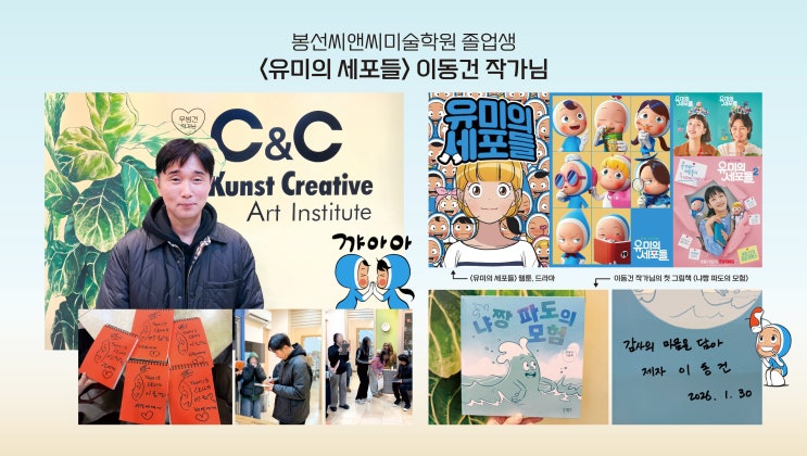 여러분 드라마로도 제작되고 애니메이션으로도 제작된 유명한 네이버 웹툰 <유미의 세포들>을 아시나요? <유미의 세포들> 작가님 이동건 작가님이 저희 봉선 씨앤씨 미술학원 출신이신데요! 곧 티빙에서 유미의 세포들 드라마 시즌 3도 방영을 하더라구요~ 이렇게 유명한 작품을 만드신 이동건 작가님께서 얼마 전에 저희 봉선 C&C 입시미술학원을 방문해주셨어요^^ 잠깐이지만 수업중이던 학생들과 간이 싸인회도 진행했는데요. 갑자기 싸인을 받게 되어서 유미의 세포들 팬이던 학생들이 너무나 좋아했어요. 인사하러 들르셔서 싸인과 동화책을 주시고 인사하고 가셨어요. 이동건 작가님의 그림책이 출간되었는데요! 「냐짱 파....... <img src="https://blogthumb.pstatic.net/MjAyNjAzMzFfMTY0/MDAxNzc0OTYwMzY5NzE2.MxLsHSqCPauJWTh6Ymy_vcHxEjaV9Ow9HRhbkemW8L4g.FZ8iG-fgu3MqvdQg2eBILSVaifFNmew0EL7VpIl4K_8g.JPEG/%C0%CC%B5%BF%B0%C7%C0%DB%B0%A1%B4%D4_%BD%BA%C5%A9%B8%B0.jpg?type=s3" />