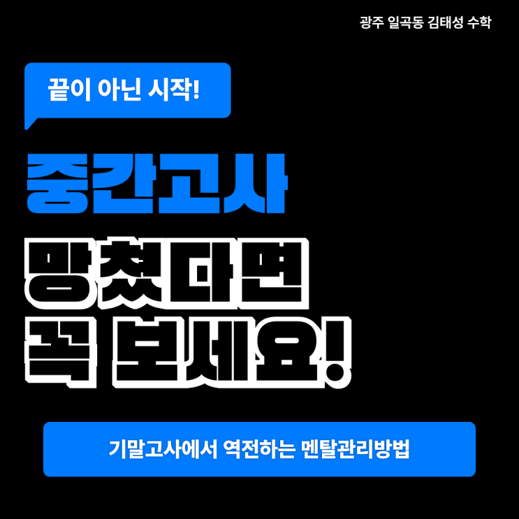 중간고사 망쳤다면 꼭 보세요! 기말고사에서 역전하는 멘탈관리방법 안녕하세요! 광주 북구 일곡동 김태성 수학학원입니다. 시험지를 받아든 순간, 머릿속이 하얘지는 느낌. 채점을 하면서 점점 가라앉는 기분. "이번 학기는 끝났다"는 생각에 공부가 손에 잡히지 않는 학생들이 많습니다. 중간고사를 망치고 나면 누구나 겪는 감정입니다. 하지만 지금 이 글을 읽고 있다면, 아직 포기하지 않았다는 뜻이겠죠? 그것만으로도 충분합니다. 중간고사는 학기 전체 성적의 30~40% 정도밖에 되지 않습니다. 아직 기말고사와 수행평가를 합하면 60% 이상의 기회가 남아 있어요! 그러니 지금 어떻게 하느냐에 따라 충분히 역전할 수 있습니다....... <img src="https://blogthumb.pstatic.net/MjAyNjAzMzBfMTgx/MDAxNzc0ODUyMTQ2NTI3.VFOSt723_2Rvqv9dJoIQvU-8tjA3SZRmht4vVFFA9hsg.PLBC2pIDXXum3WMyMrScmA6UdT9YTJvze0hPHkHaaI8g.PNG/%B1%E8%C5%C2%BC%BA_%BC%F6%C7%D0_143.png?type=s3" />