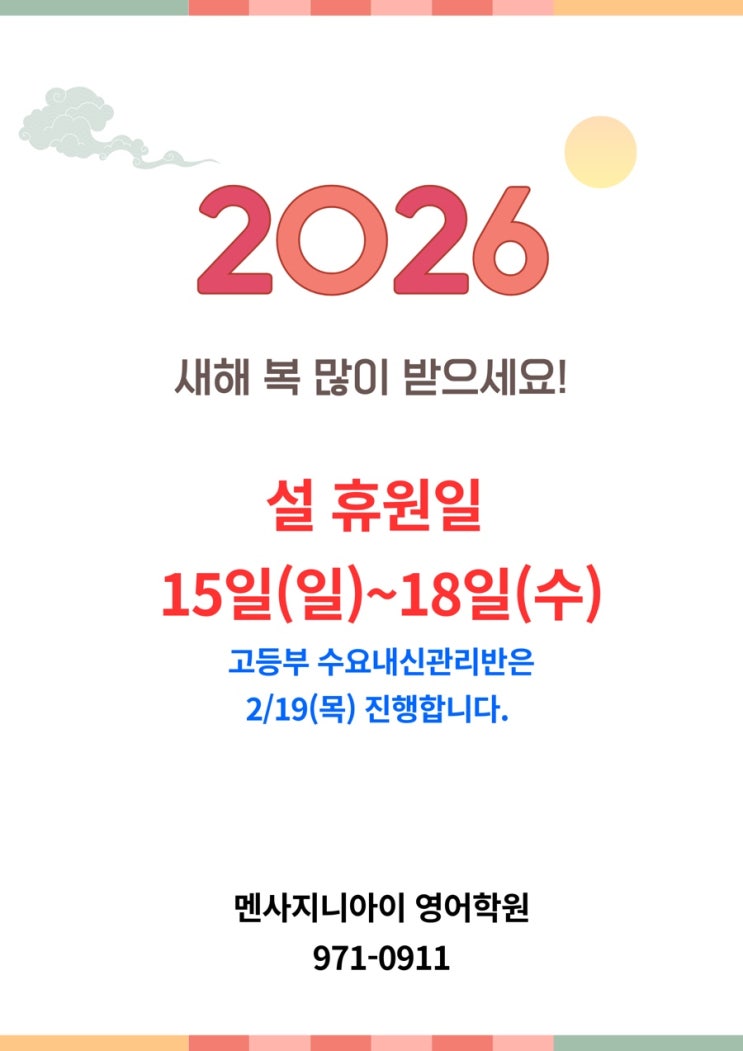 수요일 진행되는 멘사지니아이 영어학원 고등부 수요 내신관리반은 2/19(목요일)에 운영됩니다 상담 문의 971-0911 #첨단고내신반#비아고내신반#숭덕고내신반 <img src="https://blogthumb.pstatic.net/MjAyNjAyMTRfMTU5/MDAxNzcxMDQ3MDY0MzQ1.xKdf11VdwYr7gH7iRVLU_TT3F3xqewMIRLzhXkSn7a4g.E-6XqgM0VDfLSL7nlGKiWsxgPUXRdvjrZViF7htaIiIg.JPEG/IMG%A3%DF4115.jpg?type=s3" />