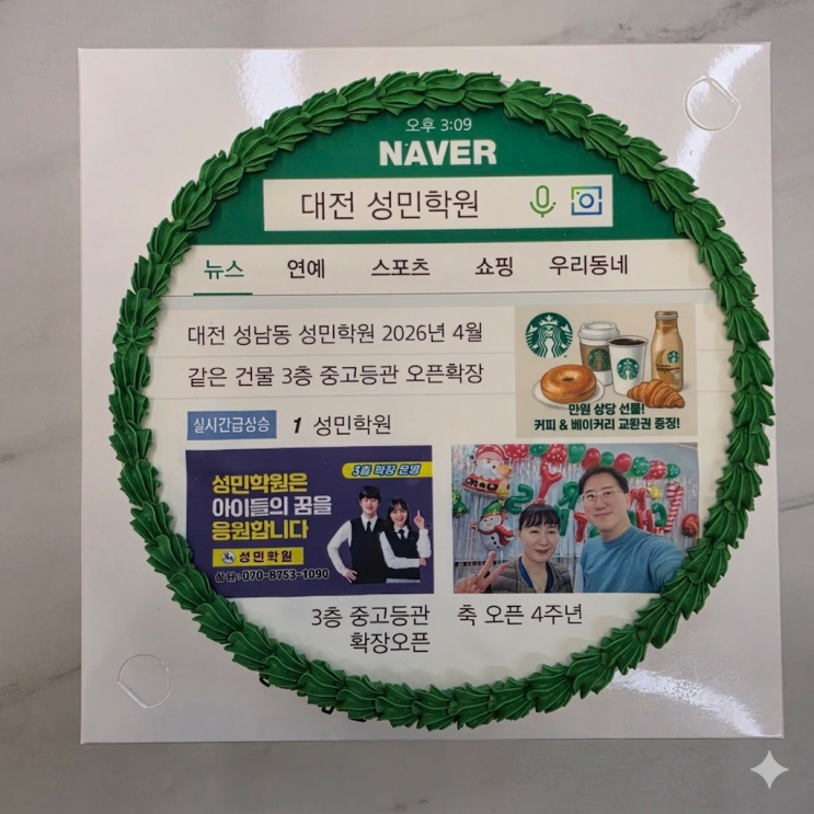 안녕하세요, 성민학원 길버트 쌤입니다. 어느덧 저희 학원이 학부모님들의 변함없는 신뢰와 아이들의 열정 덕분에 벌써 개원 4주년을 맞이했습니다. (짝짝짝! ) 이 기쁜 날을 기념하여, 특별한 네이버 성민학원 케이크 입니다. "실시간 검색어 1위, 성민학원!" 짠! 저희 학원 4주년을 축하하기 위해 학부모님이 특별 주문해서 만들어 주신 네이버 검색창 케이크입니다. 아이디어 정말 좋죠? 작년에 이어 올해도 이렇게 정성을 담아 성민학원 이름이 들어간 케이크를 보내주셔서 학부모님께 너무너무 감사드립니다. 또한, 저희 성민학원 4주년 기념과 3층 중고등관 확장 오픈도 함께 축하해 주셔서 정말 깊은 감사의 말씀을 드....... <img src="https://blogthumb.pstatic.net/MjAyNjAzMjdfNzYg/MDAxNzc0NTg0OTUyNzQ2.7z0Wp1avl0raHITMwkHsIT1qcqoVA0SE_xL-jFAtSkQg.6tmMJj4YwnBzLz3GarlFoU23j8qOh1ZvV1kKcgvYl5wg.PNG/image.png?type=s3" />
