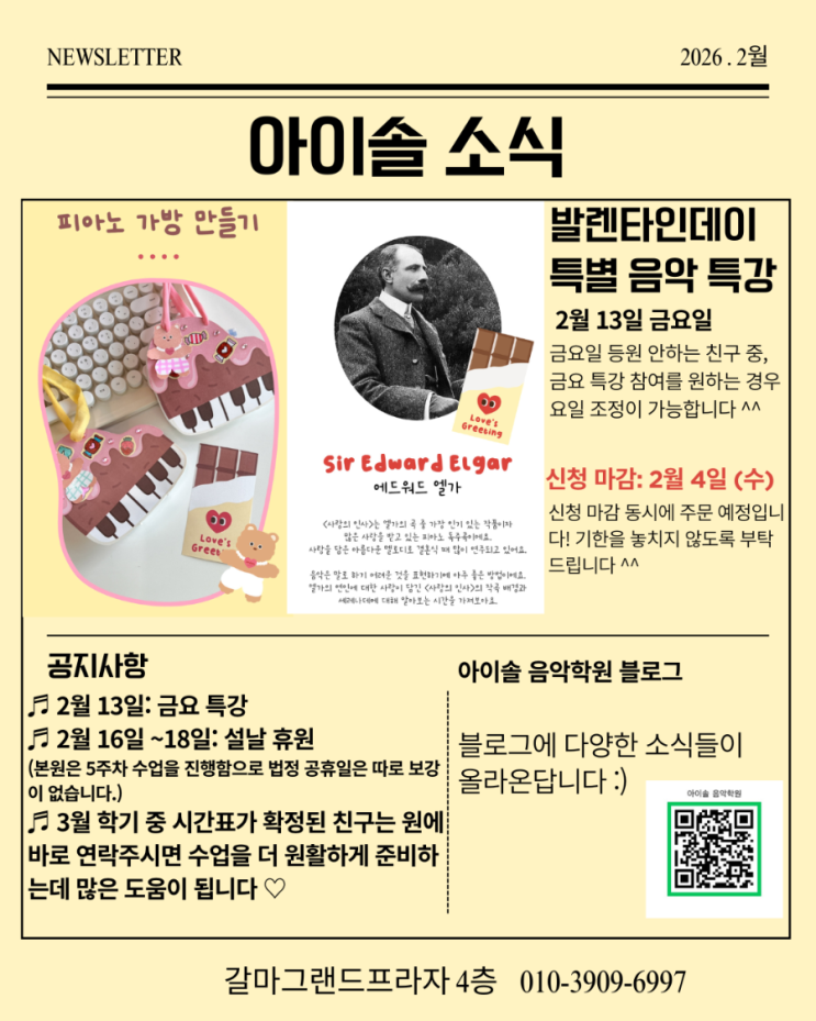 2월, 아이솔 음악학원에서는 발렌타인데이를 맞아 특별한 음악 특강을 진행합니다. 이번 특강에서는 피아노 가방 만들기 가방 속에 쏙 넣을 음표 과자 만들기 작곡가 에드워드 엘가 〈사랑의 인사〉 이야기까지 아이들이 ‘음악을 듣고, 만들고, 나누는’ 하나의 경험으로 이어질 수 있도록 준비했어요. 음표 모양 과자를 직접 만들며 음악이 더 친근해지고, 클래식이 재미있는 기억으로 남는 시간입니다. 단순히 듣고 연주하는 수업이 아니라, 이야기·감상·체험이 자연스럽게 이어지는 "아이솔만의 음악 특강"입니다. 2월 13일(금) 발렌타인데이 특별 음악 특강 금요일 수업이 없는 친구들도 참여 가능하며, 희망 시 요일 조정도 가능....... <img src="https://blogthumb.pstatic.net/MjAyNjAyMDFfMjIw/MDAxNzY5OTMwMDM4MzI3.qfT5HRiFUEQU-Ar1KI6S5PsOWyUplgrUkr885GAkWJMg.W2boLn-HXd9f2ZhzG7n2nmoIaQUT0p0srsWlMlIJjJ8g.PNG/900%A3%DF1769584195496.png?type=s3" />