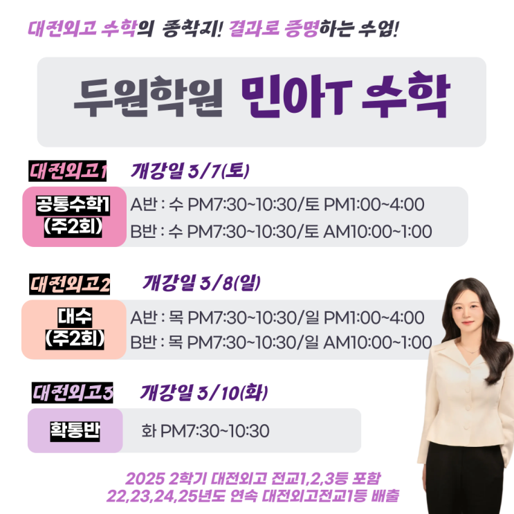 두원학원 민아T 수학 대전외고 수학 결과의 기준 압도적인 성과로 증명된 수업 ✔ 대전외고 수학 수강생 대전 최다 보유 ✔ 2025학년도 2학기 대전외고 전교 1,2,3등 포함 ✔1등급 35명 중 22명 배출(1,2학년 합산) ✔2022,2023,2024,2025 연속 대전외고 전교1등 배출 및 전교유일 100점 배출 왜 민아T 수학인가? ✔ 출제 의도까지 꿰뚫는 외고 맞춤 수업 ✔ 개념 → 적용 → 실전까지 끊김 없는 구조 ✔ 학생 한 명 한 명 확실한 클리닉 ✔ 결과로 책임지는 수업 방식 2025학년도 2학기 개강 안내 대전외고1 : 공통수학Ⅰ (주 2회) 3/7(토) 개강 대전외고2 : 대수 (주 2회) 3/8(일) 개강 대전외고3 : 확통반 3/10(화) ....... <img src="https://blogthumb.pstatic.net/MjAyNjAxMzBfMTAz/MDAxNzY5NzU0MDk1MzU2.H3ToAJ7RD3T8C7z1wMMeb-6XOJW0L2x_QC1_FVsXBYkg.EsK-f-YkMzB61WEpb_NC-qb5NhXppH-Hn9bzSTOdx_og.PNG/%C1%A6%B8%F1%C0%BB-%C0%D4%B7%C2%C7%D8%C1%D6%BC%BC%BF%E4_-001_%2849%29.png?type=s3" />
