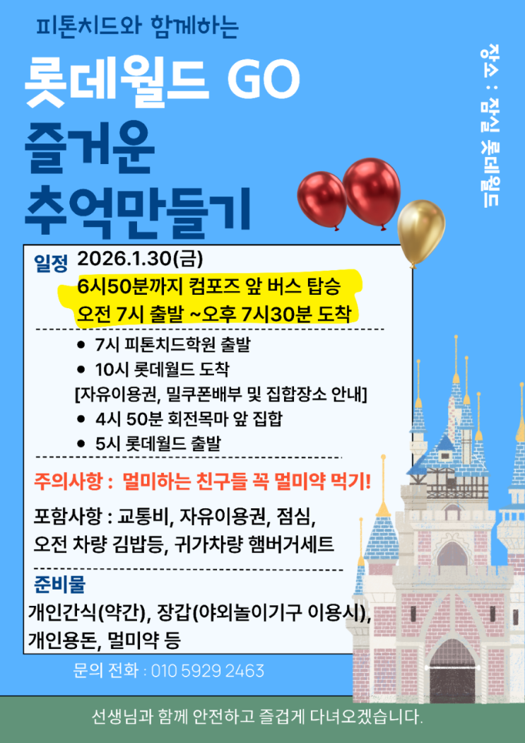 2026년 1월 열심히 공부하던 우리^^ 오늘은 진짜 힐링하며 신나게 즐기는날~!! 아이들은 많이 설레이고.. 선생님들은 아이들 데리고 건강하고 안전한 여행을 위해 긴장 상태로 출발~ 우리아이들 학원에서는 볼수없었던 세상 행복한 표정을 보며.. 이벤트가 아이들한테 얼마나 중요한지 또 한번 느끼게 되어요~❤️ 오늘 이렇게 질서 잘 지키며 잘 따라와준 울 아이들 원장쌤은 또 다음 이벤트 고민해볼께요~ 집으로가는 차안은 피곤하지도 않은지 시끌시끌 합니다~ <img src="https://blogthumb.pstatic.net/MjAyNjAxMzBfMjkz/MDAxNzY5NzYxOTc2OTI0.SbaDEz6YtAkes_eUAkKNCYkP4e2vPlNOpKlqzVQhx4wg.cA5kP5UJ255bTrHbv-1JNvgsawIgUsxnRq58OTWME9sg.PNG/900%A3%DF1769518409536.png?type=s3" />