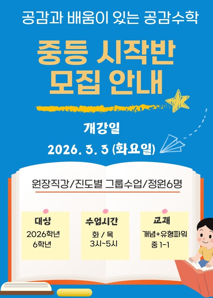 중요한 것은 진짜 아는 것!!! 안녕하세요. 공감과 배움이 있는 공감수학 입니다^^ 2026학년도 6학년 친구들을 대상으로 3월에 개강하는 중등과정 시작반 안내드립니다!!! 개강일 3월3일 {화요일} 수업시간 화/ 목 주2회 3시~ 5시 수업교재 개념+유형파워 중1-1 정원 6명 궁금하신 문의사항은 네이버톡톡 이나 문자로 남겨주시면 확인후 연락드리겠습니다^^ 교육문의 : 010-3312-0982 <img src="https://blogthumb.pstatic.net/MjAyNjAxMzFfMTgy/MDAxNzY5ODUxNzE4MDI5.xmF5RsbJVQg6Wgmr66ufzQFt4NWONCYMOyyUpxTsyXcg.FQI5eytZe4vmTcg-9ARi-cGycjo5OzGrOEdV5PPwG8Yg.JPEG/1769851717073.jpg?type=s3" />