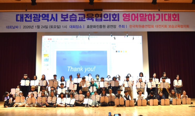 지난 1월, 대전광역시 보습교육협의회 주관 영어말하기대회에서 우리 학원 아이들이 정말 값진 성과를 거두었습니다. 무대 위에서 또박또박 영어로 자신의 생각을 발표하던 모습, 발표를 마치고 환한 얼굴로 서 있던 아이들의 표정이 아직도 생생합니다. 이번 대회에서 국회의원상(표창장) 이라는 큰 상을 수상하게 되었어요. 아이들 한 명 한 명이 받은 상장에는 그동안의 노력, 연습, 그리고 용기가 고스란히 담겨 있었습니다. 결과도 물론 중요하지만, 더 값진 건 사람들 앞에서 영어로 말해보는 경험, 그리고 스스로 해냈다는 자신감이었습니다. 마지막으로 모두 함께 찍은 단체사진을 보니 정말 뿌듯함이 두 배, 세 배가 되네요 열....... <img src="https://blogthumb.pstatic.net/MjAyNjAxMzBfMTA5/MDAxNzY5NzUyNjQwNjU5.AQlDT0zXTcyvZhQ908az7Fxr7tJvAwCqGpEpsXcJUhAg.A0c5kVl4WXjQEJhWeHSNIgncbL_EW79VP4y477hol5kg.JPEG/IMG%A3%DF8058.JPG?type=s3" />
