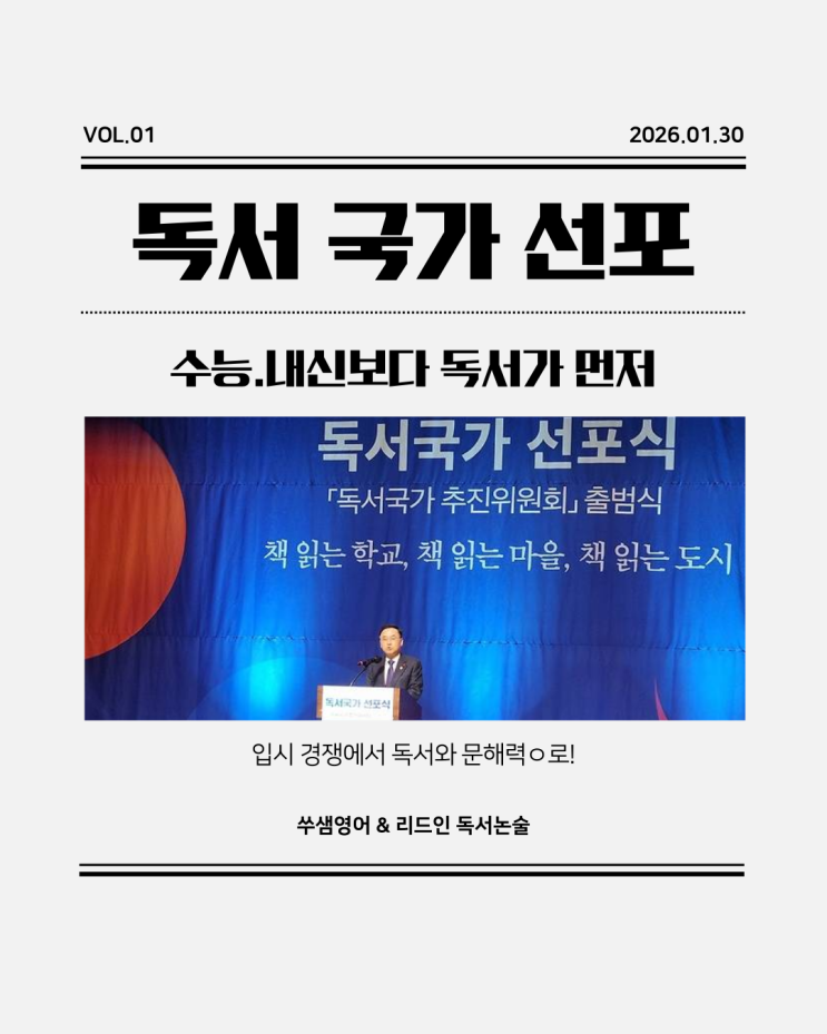 독서 국가 선포! 대전 지족동·반석동 학부모님이 꼭 알아야 할 변화 지난 1월 23일, 정부가 ‘독서 국가’를 공식 선포했습니다. 단순한 행사나 슬로건이 아닌, 향후 교육정책의 방향 자체가 ‘문해력’ 중심으로 바뀌는 커다란 흐름이라는 점에서 큰 의미가 있습니다. 왜 ‘독서 국가’인가요? 최근 교육계에서는 학생들의 문해력 저하 문제가 꾸준히 제기되어 왔습니다. 중3, 고2 학생 10명 중 1명이 국어 수업 내용을 이해하지 못한다는 보고도 있었죠. 짧고 자극적인 콘텐츠에 익숙해진 요즘 아이들에게 ‘깊이 읽고, 생각하는 힘’을 길러주기 위한 국가적 대책으로 독서 중심 정책이 나온 것입니다. (얼마나 심각하면....ㅠㅠ) 단계별....... <img src="https://blogthumb.pstatic.net/MjAyNjAyMDFfMTkw/MDAxNzY5OTI3MjAyOTYy.g2crJb-vfm8AjZMqvAyC-hgVxIe97LKmljAZyj7qH2Yg.7-pbCe74ki44FvktgoJvRu0jMoBN76i5qWzNUINHBvYg.PNG/KakaoTalk_20260130_113052270.png?type=s3" />