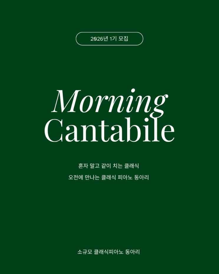 모닝 칸타빌레는 피아노를 좋아하는 취미생들이 오전에 모여 연주하고, 이야기하는 동아리 같은 피아노 모임 입니다. 혼자 말고, 같이 치는 클래식 잘치는 것보다, 연주와 대화가 있는 피아노 시간 입니다. [ 연주 + 연습 + 대화 + 레슨 ] = 1시간 실력보다는 즐거운 지속과 교류를 목표로 합니다. 문의 010-8258-6480 #전민동동아리#전민동모임#전민동피아노#문지동동아리#문지동모임#대전피아노모임#대전클래식피아노#대전취미#대전오전모임#대전동아리#용산동피아노#전민동취미피아노#전민동직장인#전민동 <img src="https://blogthumb.pstatic.net/MjAyNjAyMDJfMTc2/MDAxNzY5OTk0ODgzMzkz.8xA5_bchqp9LMLOaUdmj7vXm1gBmNqPPGZ-l8bRFxgog.0cuBEc76H43n0Ldo_6RnU8b9JxBw_457bdMLq12W614g.PNG/Morning_%A3%AD_1.png?type=s3" />